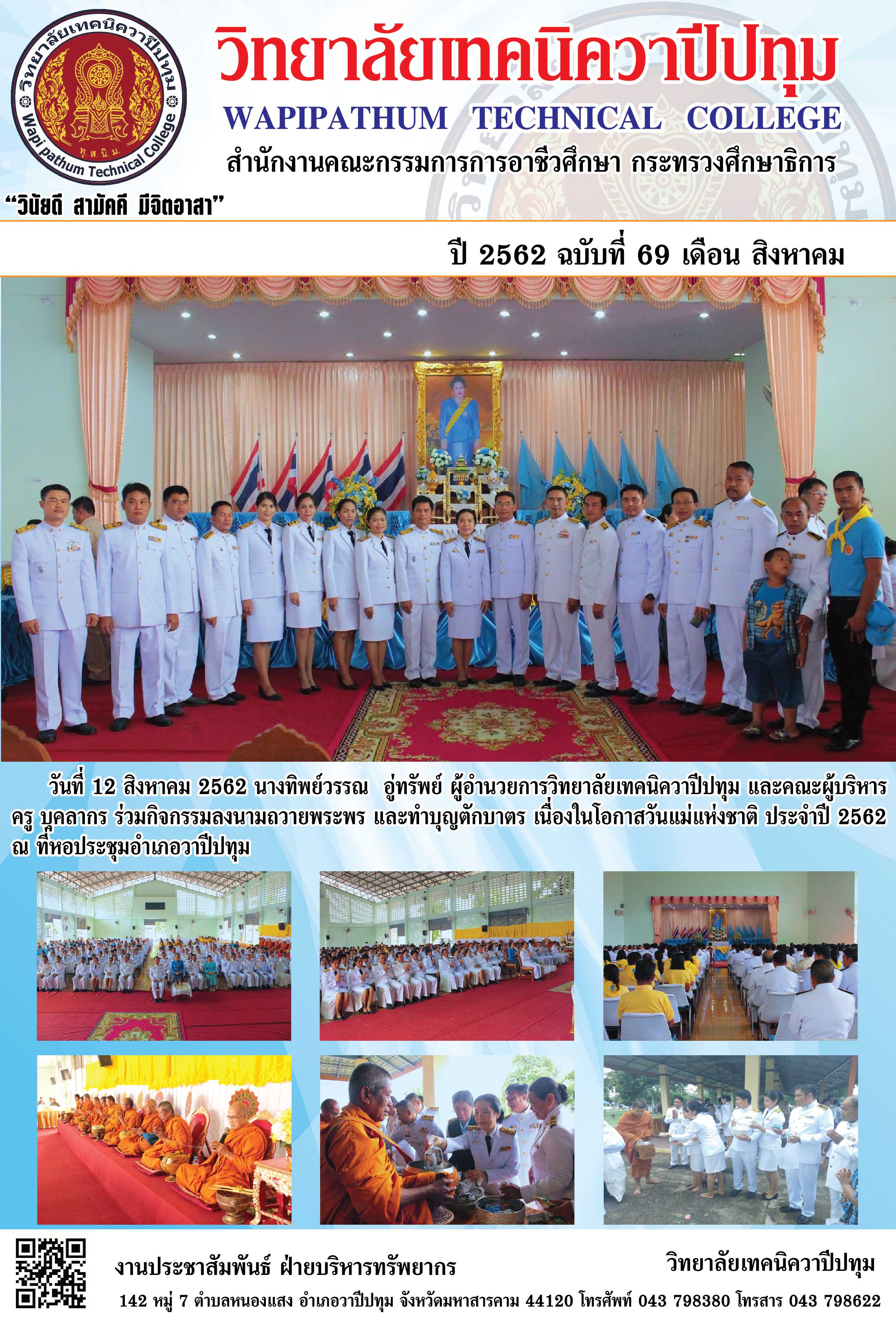 วิทยาลัยเทคนิควาปีปทุม เข้าร่วมกิจกรรมลงนามถวายพระพร และทำบุญตักบาตร เนื่องในโอกาสวันแม่แห่งชาติ ประจำปี 2562 ณ ที่หอประชุมอำเภอวาปีปทุม