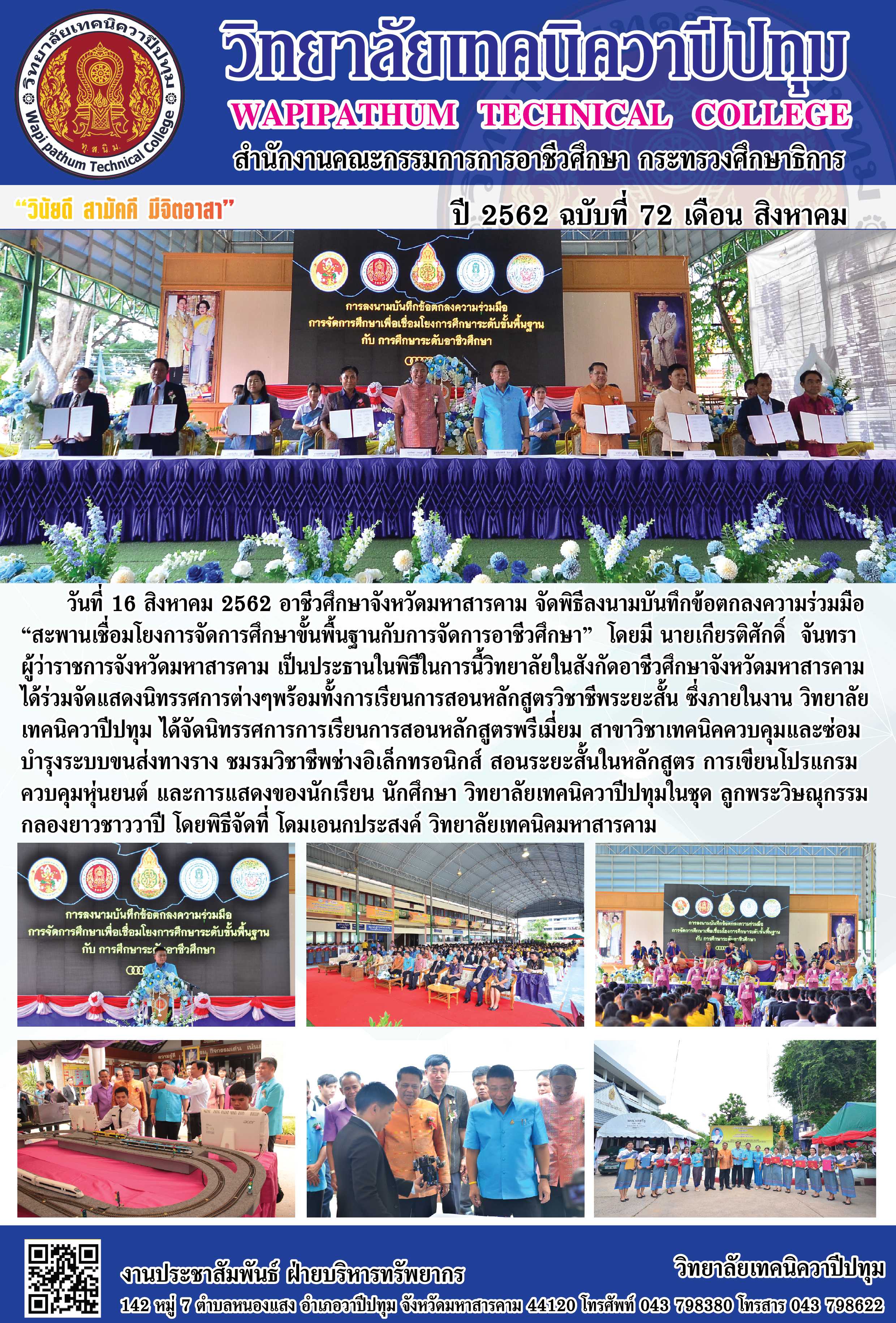 วิทยาลัยเทคนิควาปีปทุม เข้าร่วมพิธีลงนามบันทึกข้อตกลงความร่วมมือ สะพานเชื่อมโยงการจัดการศึกษาขั้นพื้นฐานกับการจัดการอาชีวศึกษา ณ โดมเอนกประสงค์ วิทยาลัยเทคนิคมหาสารคาม