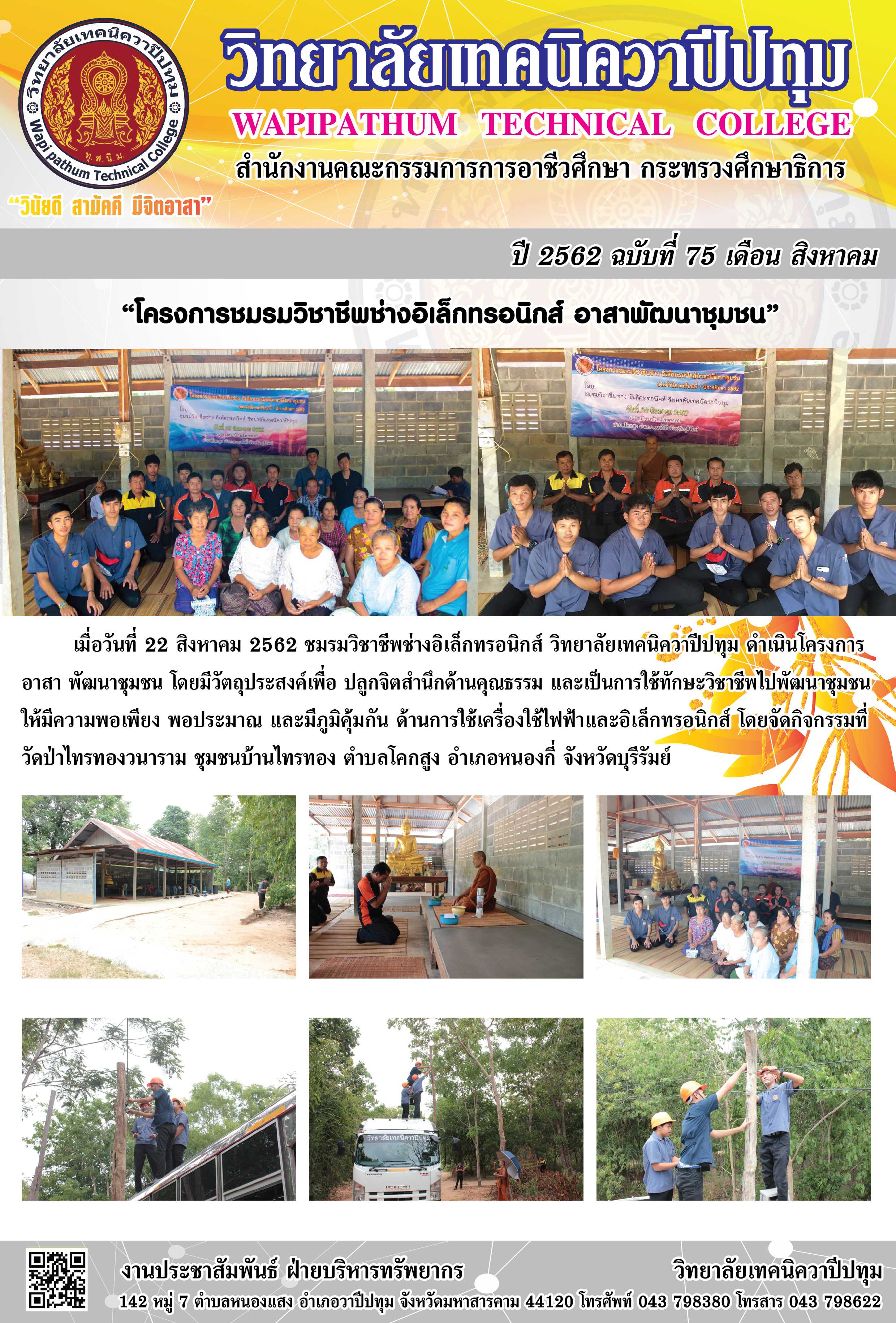 วิทยาลัยเทคนิควาปีปทุม ได้ดำเนินโครงการอาสา พัฒนาชุมชน โดยมีวัตถุประสงค์เพื่อ ปลูกจิตสำนึกด้านคุณธรรม และเป็นการใช้ทักษะวิชาชีพไปพัฒนาชุมชนให้มีความพอเพียง