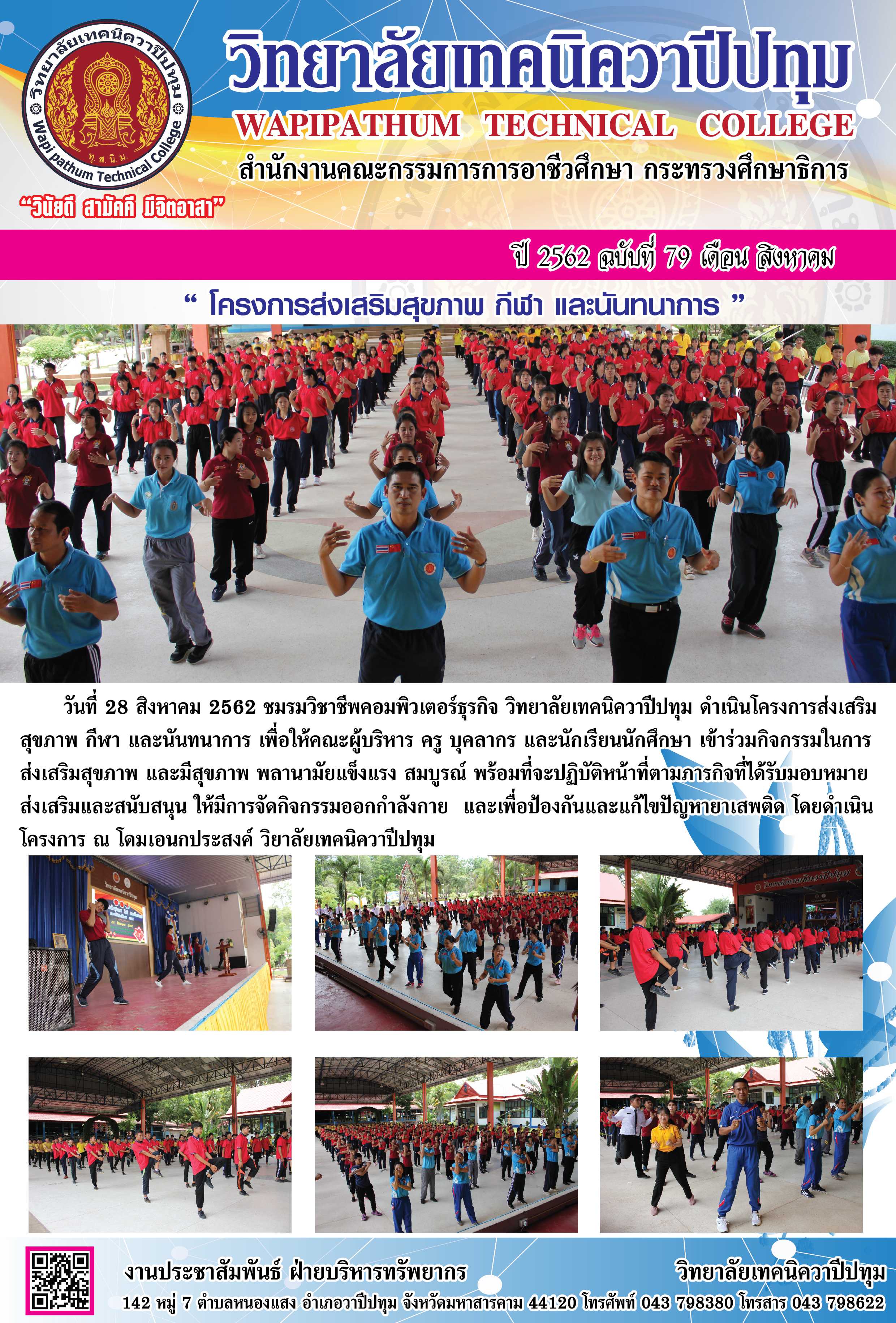 วิทยาลัยเทคนิควาปีปทุม ชมรมวิชาชีพคอมพิวเตอร์ธุรกิจ ดำเนินโครงการส่งเสริมสุขภาพ กีฬา และนันทนาการ เพื่อให้คณะผู้บริหาร ครู บุคลากร และนักเรียนนักศึกษา เข้าร่วมกิจกรรมใน การส่งเสริมสุขภาพ