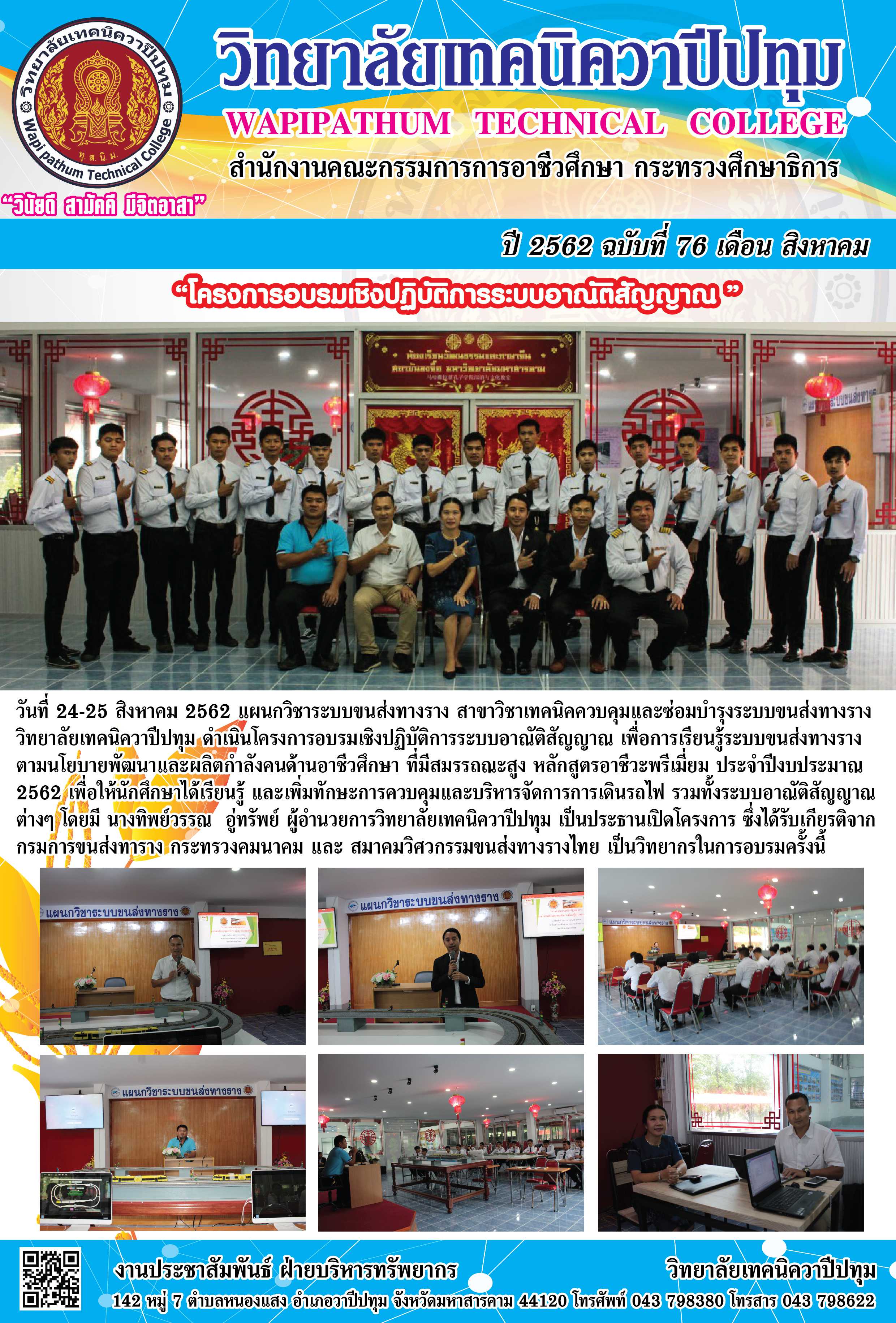 วิทยาลัยเทคนิควาปีปทุม ได้ดำเนินโครงการอบรมเชิงปฏิบัติการระบบอาณัติสัญญาณ เพื่อการเรียนรู้ระบบขนส่งทางราง ตามนโยบายพัฒนาและผลิตกำลังคนด้านอาชีวศึกษา ที่มีสมรรถณะสูง หลักสูตรอาชีวะพรีเมี่ยม