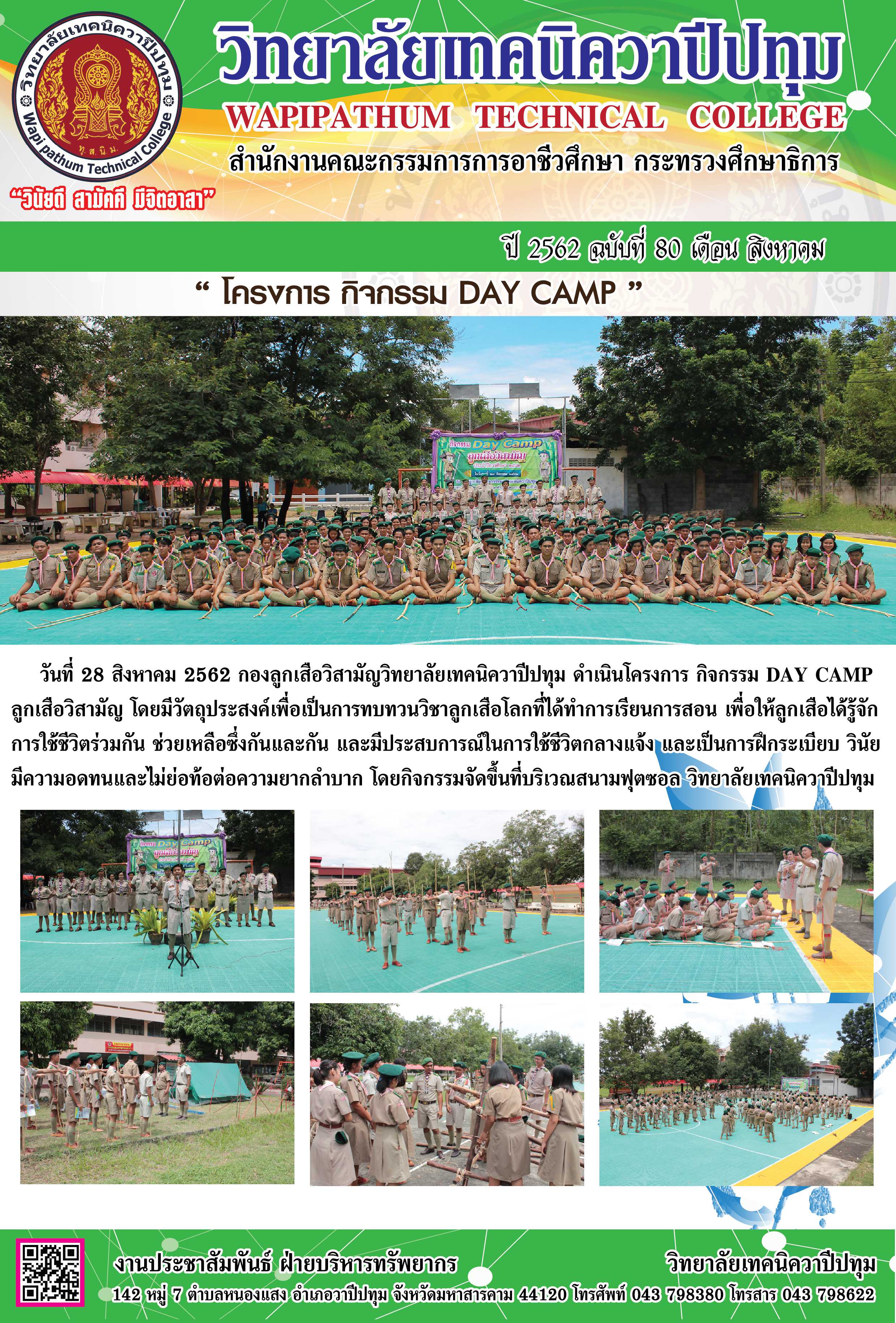 วิทยาลัยเทคนิควาปีปทุม ดำเนินโครงการ กิจกรรม DAY CAMP ลูกเสือวิสามัญ โดยมีวัตถุประสงค์เพื่อเป็นการทบทวนวิชาลูกเสือโลก ที่ได้ทำการเรียนการสอน