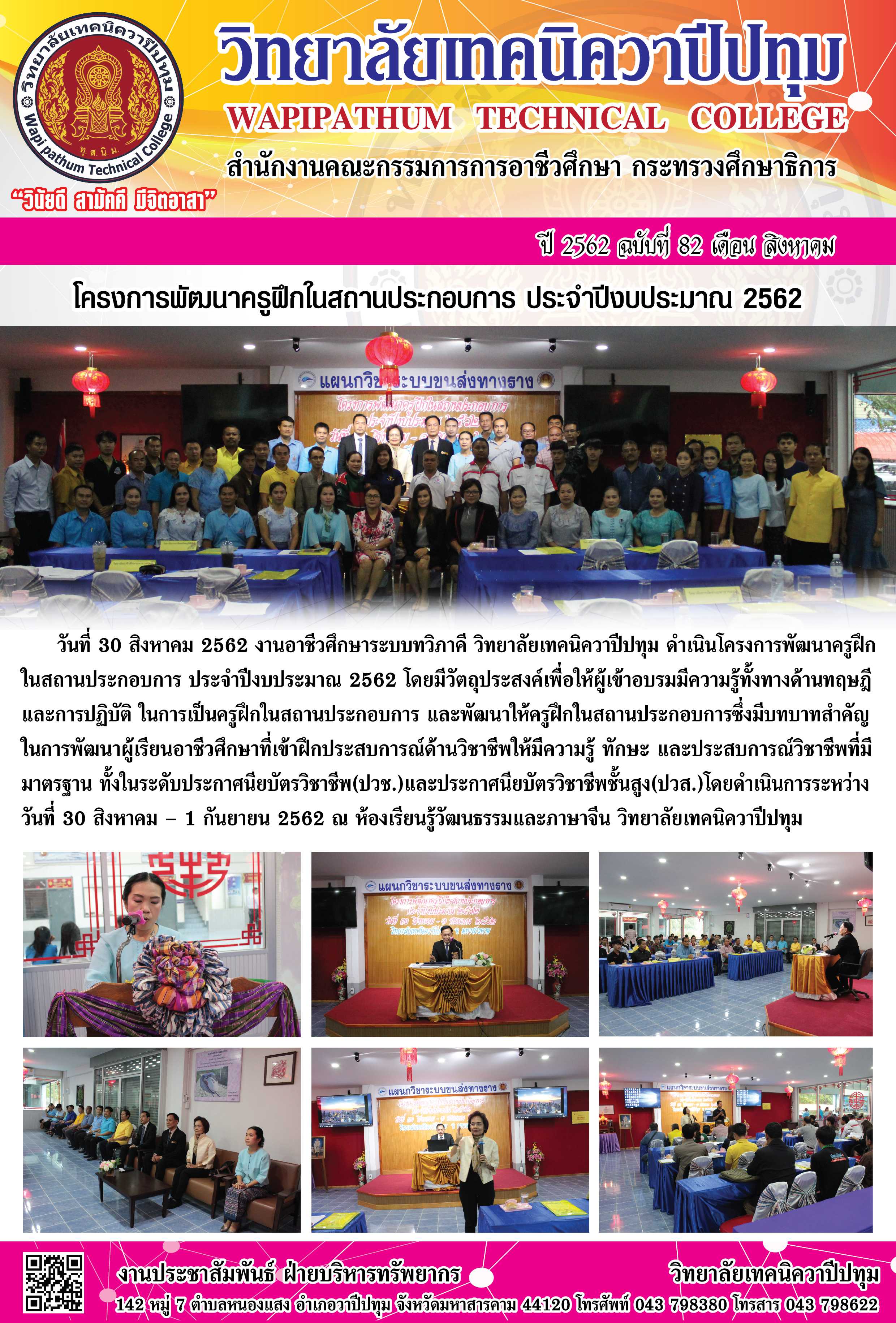 งานอาชีวศึกษาระบบทวิภาคี วิทยาลัยเทคนิควาปีปทุม ดำเนินโครงการพัฒนาครูฝึกในสถานประกอบการ ประจำปีงบประมาณ 2562