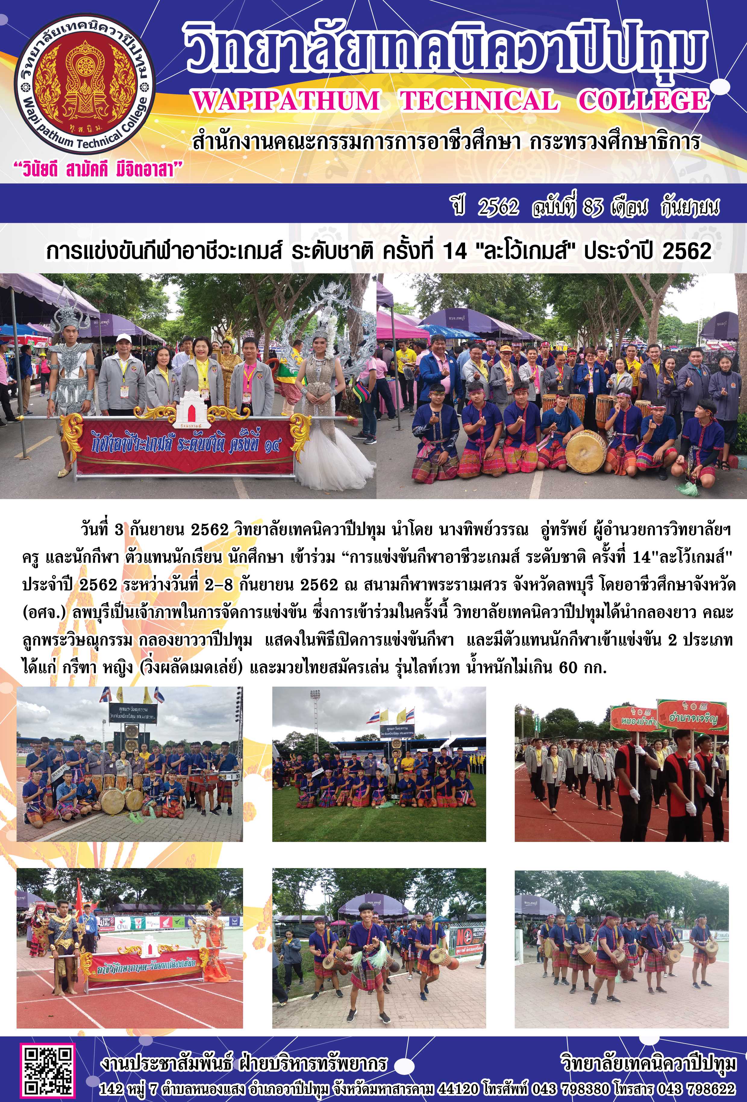 วิทยาลัยเทคนิควาปีปทุม เข้าร่วมการแข่งขันกีฬาอาชีวะเกมส์ ระดับชาติ ครั้งที่ 14 ละโว้เกมส์ ประจำปี 2562