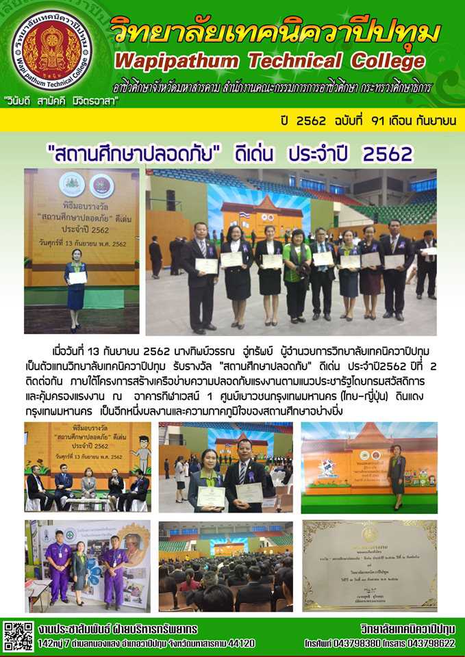 วิทยาลัยเทคนิควาปีปทุม เข้ารับรางวัล สถานศึกษาปลอดภัย ดีเด่น ประจำปี 2562
