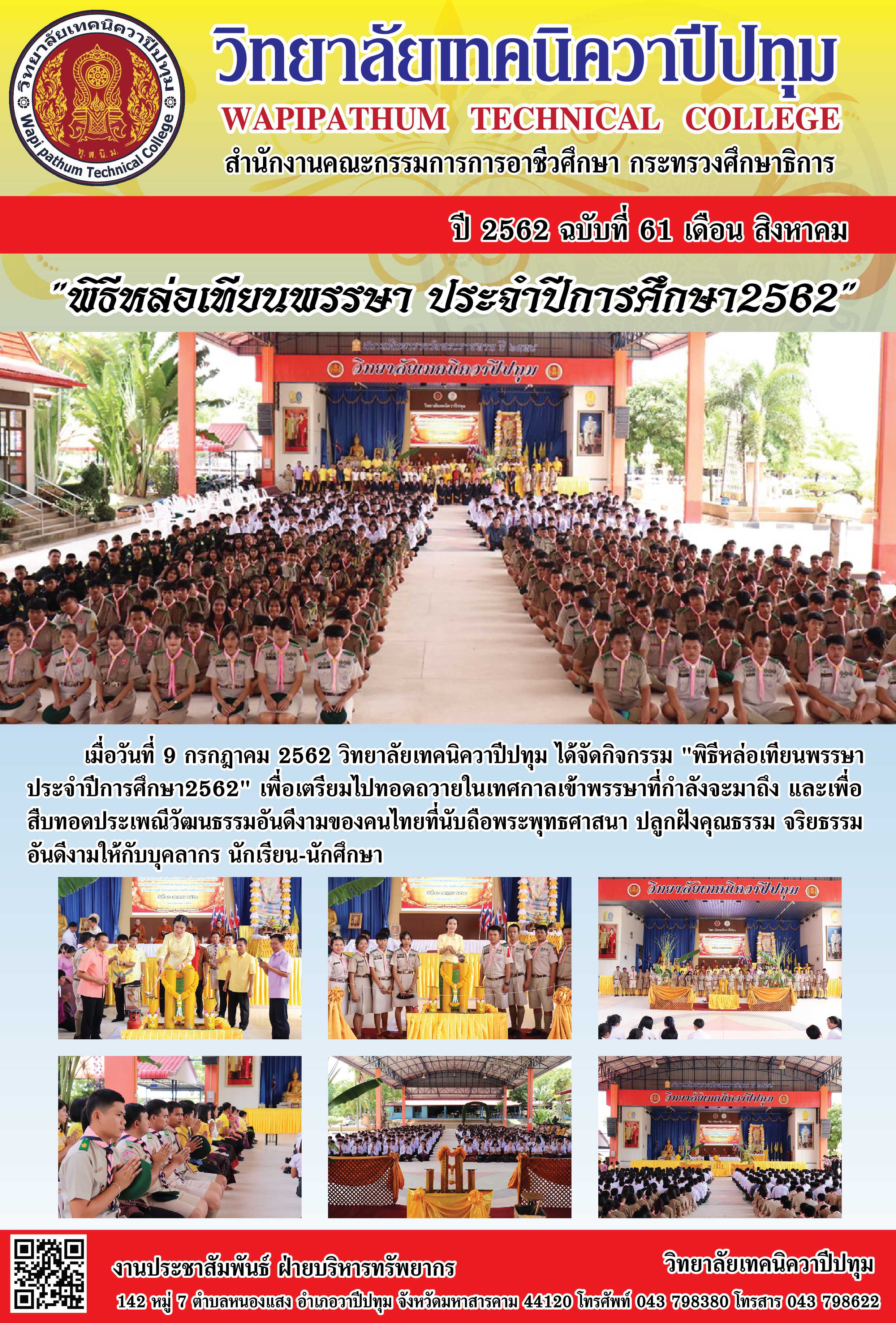 วิทยาลัยเทคนิควาปีปทุม จัดโครงการส่งเสริมวัฒนธรรมไทย วัฒนธรรมท้องถิ่น และขับเคลื่อนสถานศึกษาคุณธรรม หล่อเทียนพรรษา เนื่องในวันเข้าพรรษา ประจำปีการศึกษา ๒๕๖๒