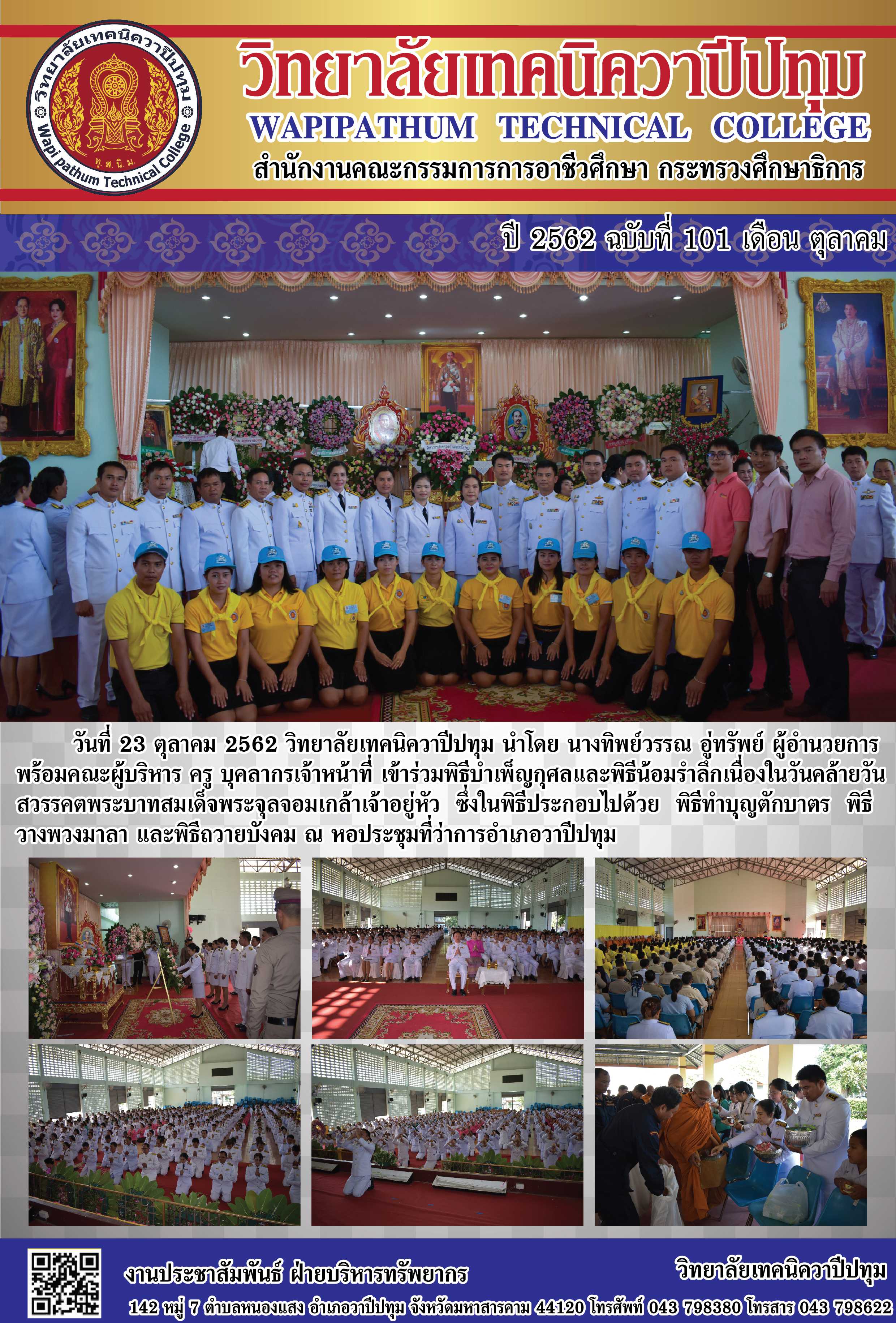 วิทยาลัยเทคนิควาปีปทุม ร่วมพิธีบำเพ็ญกุศลและพิธีน้อมรำลึกเนื่องในวันคล้ายวันสวรรคตพระบาทสมเด็จพระจุลจอมเกล้าเจ้าอยู่หัว ณ หอประชุมที่ว่าการอำเภอวาปีปทุม