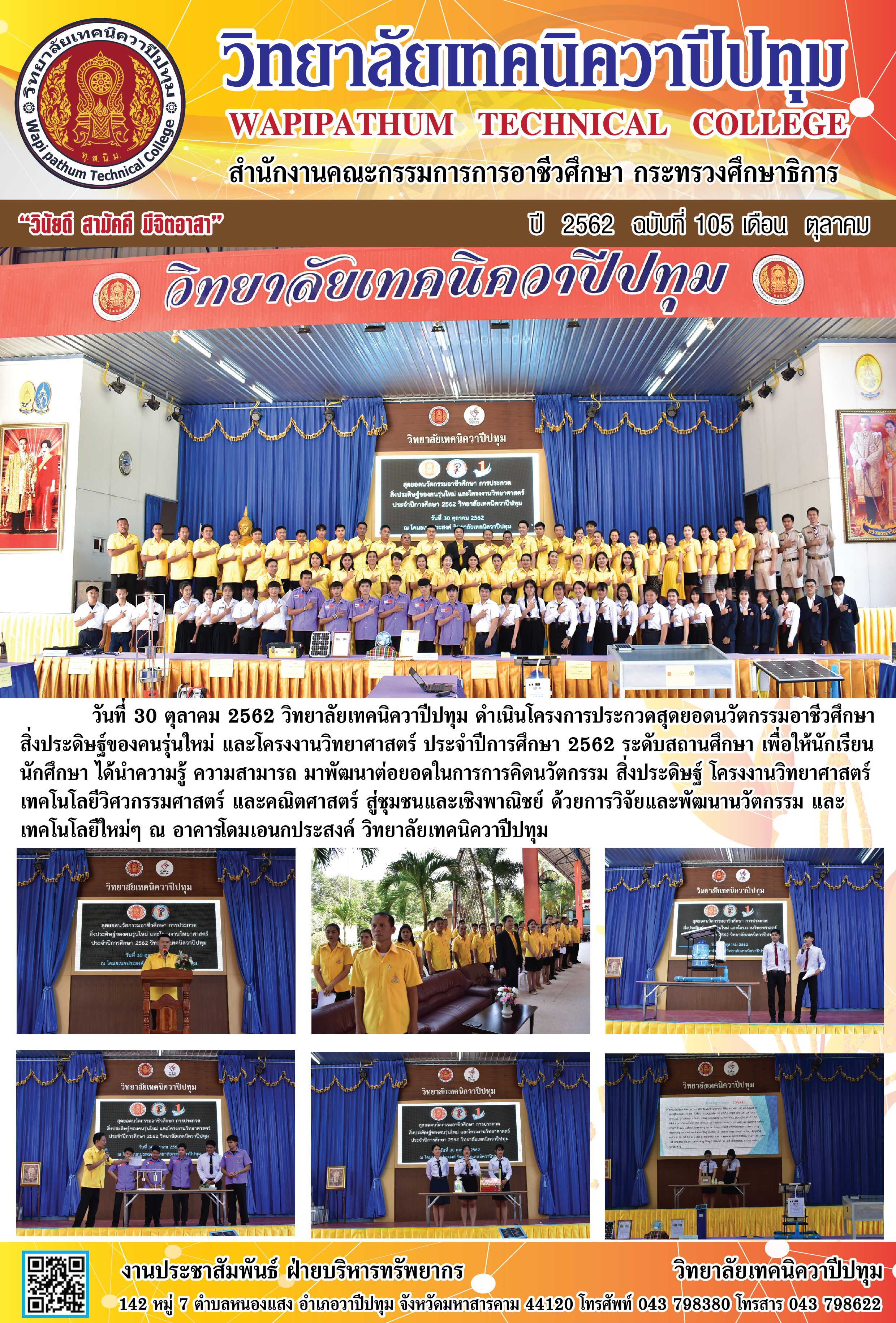 วิทยาลัยเทคนิควาปีปทุม ดำเนินโครงการประกวดสุดยอดนวัตกรรมอาชีวศึกษา สิ่งประดิษฐ์ของคนรุ่นใหม่ และโครงงานวิทยาศาสตร์ ประจำปีการศึกษา 2562 ระดับสถานศึกษา ณ อาคารโดมเอนกประสงค์ วิทยาลัยเทคนิควาปีปทุม