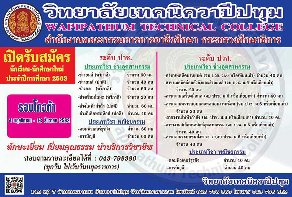 ประกาศวิทยาลัยเทคนิควาปีปทุม เรื่อง การรับสมัครคัดเลือกนักเรียน นักศึกษา เข้าศึกษาต่อในหลักสูตรประกาศนียบัตรวิชาชีพ (ปวช.) และหลักสูตรประกาศนียบัตรวิชาชีพชั้นสูง (ปวส) ประจำปีการศึกษา 2563 (รอบโควตา)