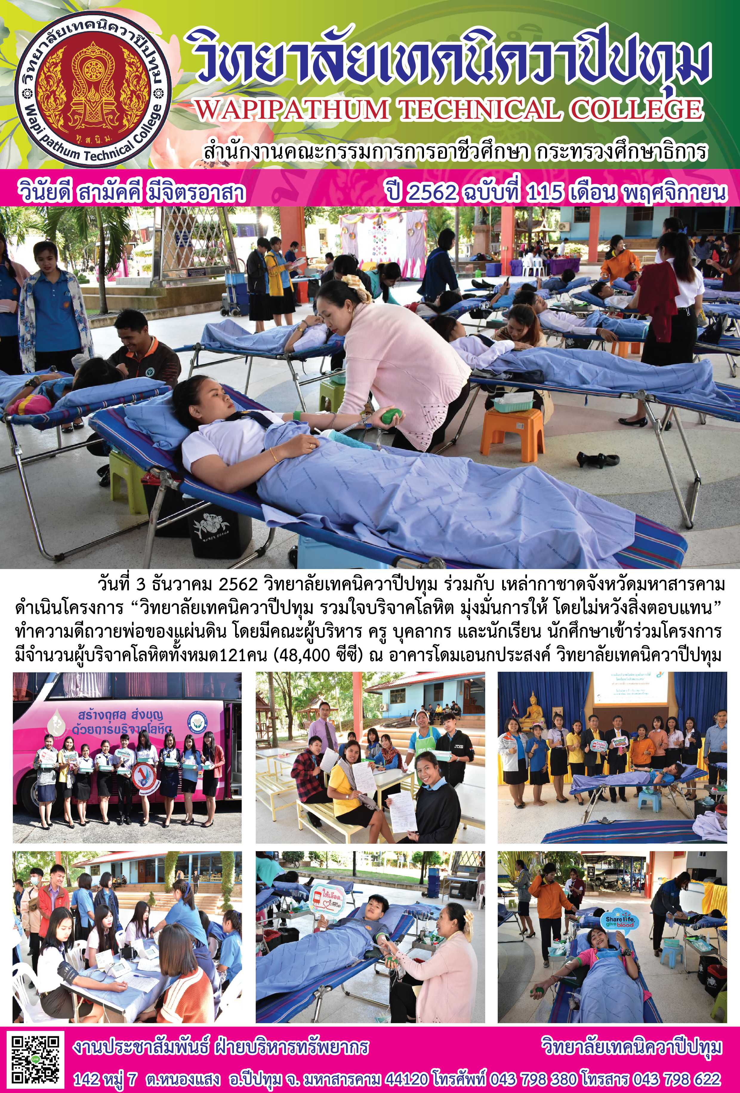วิทยาลัยเทคนิควาปีปทุม ร่วมกับ เหล่ากาชาดจังหวัดมหาสารคาม ดำเนินโครงการ วิทยาลัยเทคนิควาปีปทุม รวมใจบริจาคโลหิต มุ่งมั่นการให้ โดยไม่หวังสิ่งตอบแทน ทำความดีถวายพ่อของแผ่นดิน ณ อาคารโดมเอนกประสงค์