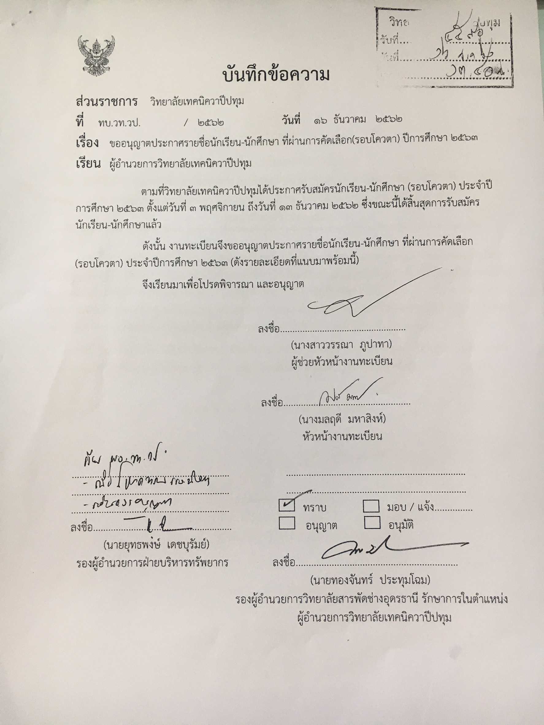 ประกาศรายชื่อนักเรียน-นักศึกษา ที่ผ่านการคัดเลือก(รอบโควตา) ปีการศึกษา ๒๕๖๓