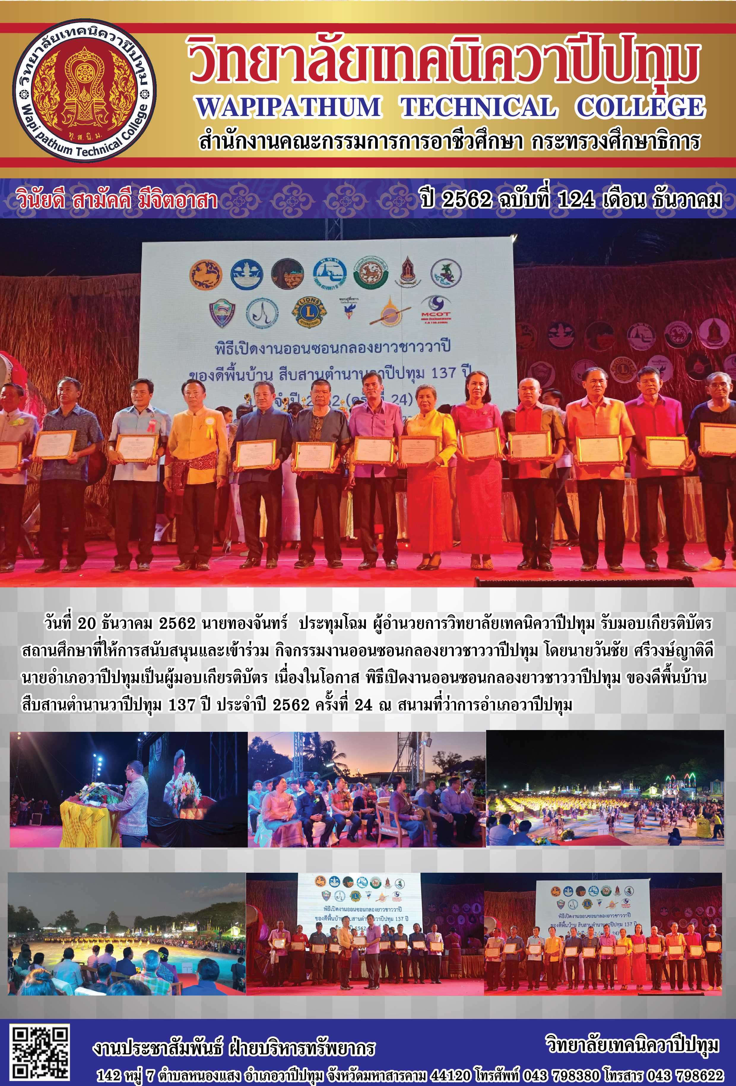 วิทยาลัยเทคนิควาปีปทุม รับมอบเกียรติบัตร สถานศึกษาที่ให้การสนับสนุนและเข้าร่วมกิจกรรมงานออนซอนกลองยาวชาววาปีปทุม เนื่องในโอกาส พิธีเปิดงานออนซอนกลองยาวชาววาปีปทุม ของดีพื้นบ้านสืบสานตำนานวาปีปทุม137ปี