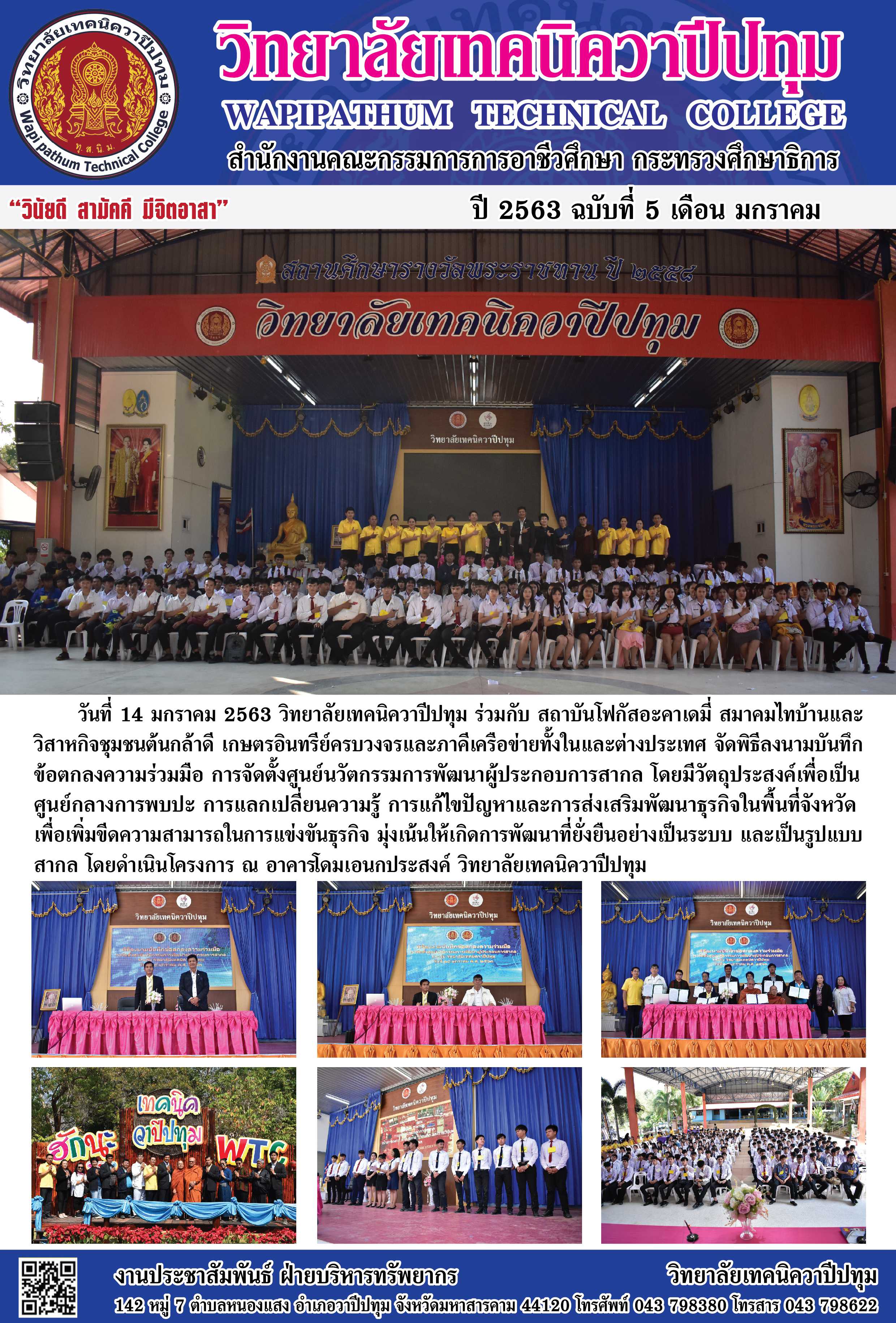 วิทยาลัยเทคนิควาปีปทุม ร่วมกับ สถาบันโฟกัสอะคาเดมี่ สมาคมไทบ้านและวิสาหกิจชุมชนต้นกล้าดี เกษตรอินทรีย์ครบวงจรและภาคีเครือข่ายทั้งในและต่างประเทศ จัดพิธีลงนามบันทึกข้อตกลงความร่วมมือ