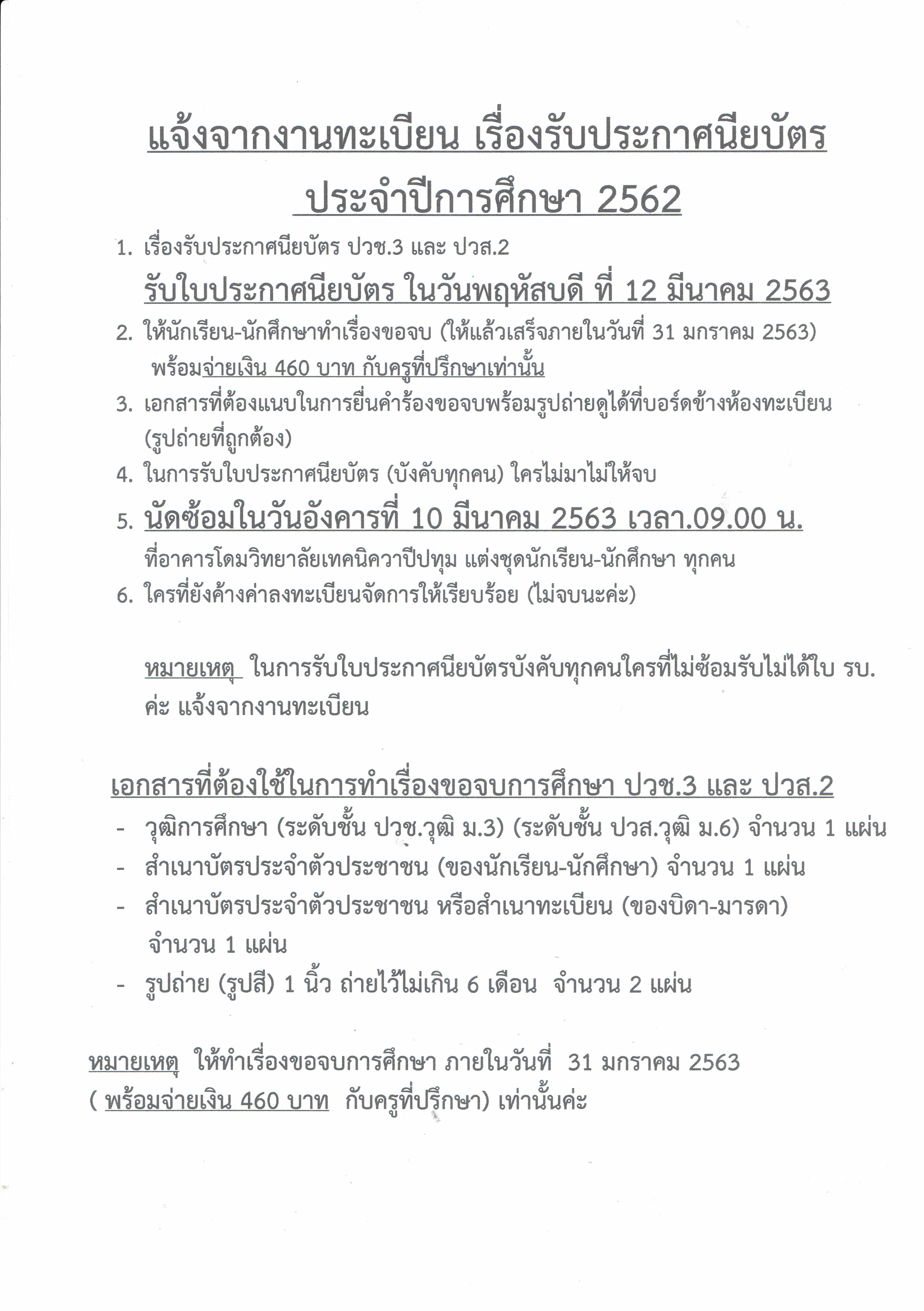 แจ้งจากงานทะเบียน เรื่องรับประกาศนียบัตร ประจำปีการศึกษา 2562