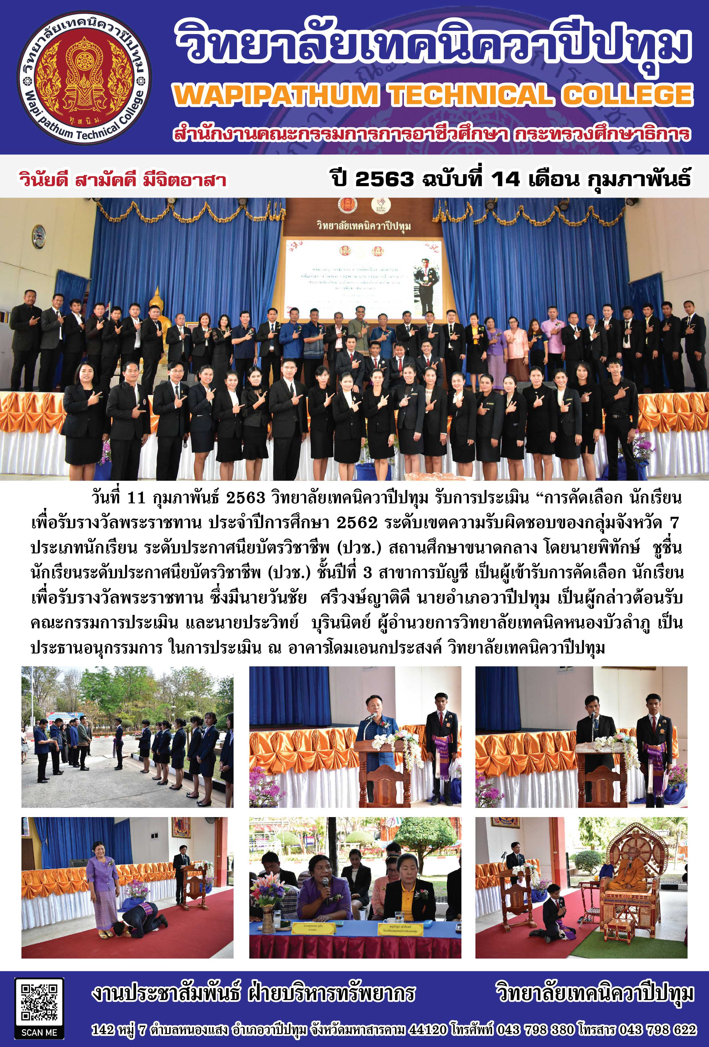 วิทยาลัยเทคนิควาปีปทุม รับการประเมิน การคัดเลือก นักเรียน เพื่อรับรางวัลพระราชทาน ประจำปีการศึกษา 2562 ระดับเขตความรับผิดชอบของกลุ่มจังหวัด 7 ประเภทนักเรียน ระดับ ปวช. สถานศึกษาขนาดกลาง