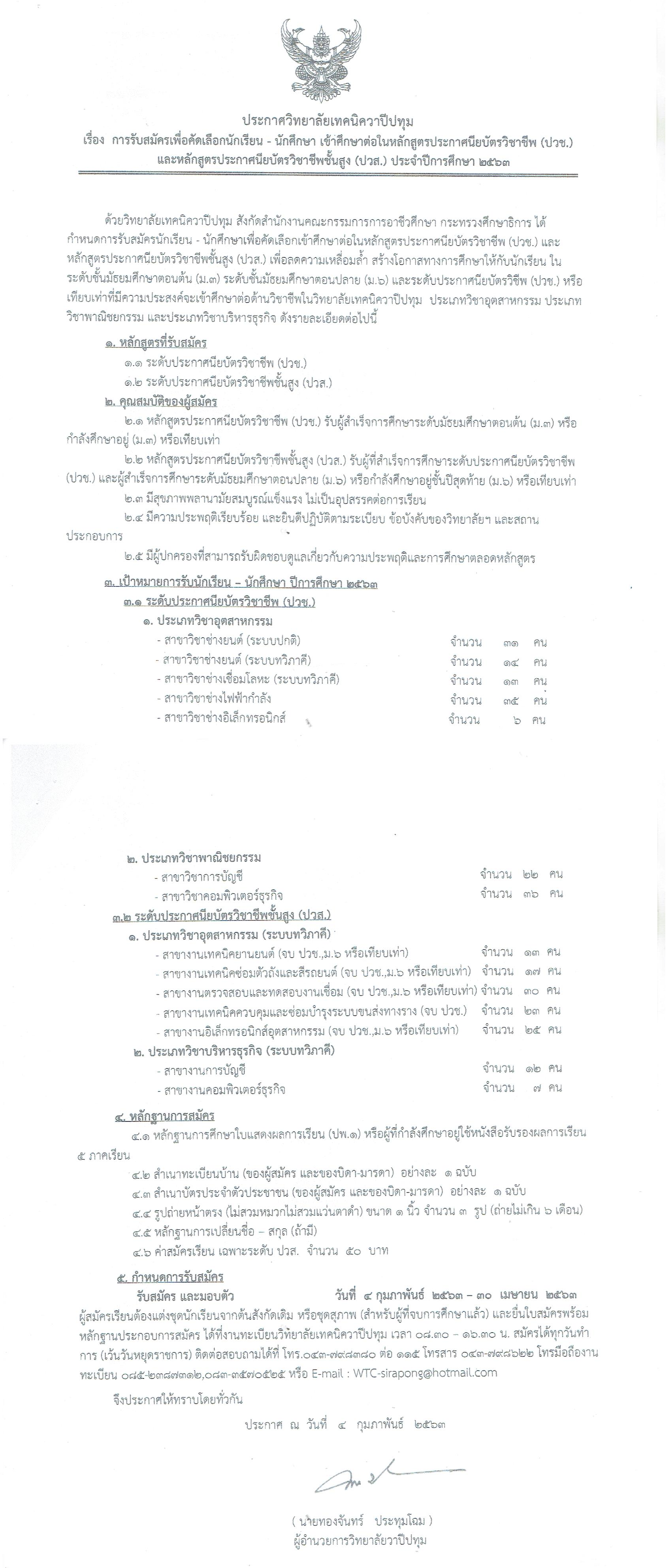 ประกาศวิทยาลัยเทคนิควาปีปทุม เรื่อง การรับสมัครเพื่อคัดเลือกนักเรียน - นักศึกษา เข้าศึกษาต่อในหลักสูตร ปวช. และ ปวส. ประจำปีการศึกษา 2563