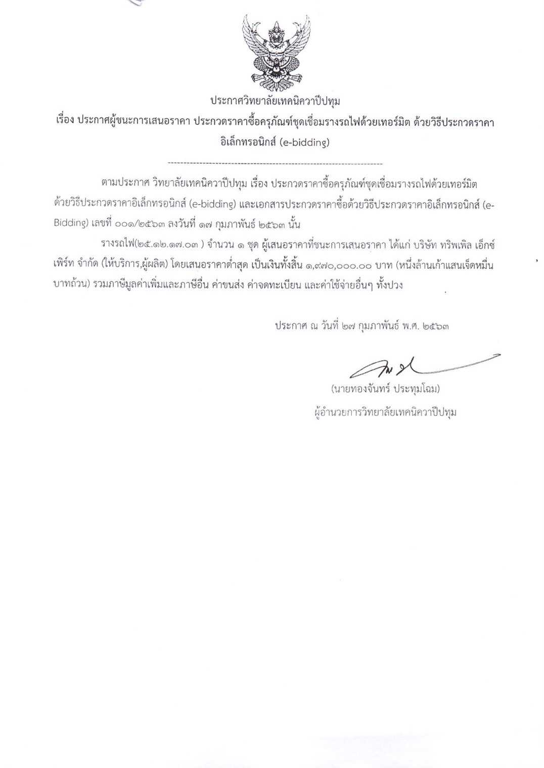 ประกาศผู้ชนะการเสนอราคา ประกวดราคาซื้อครุภัณฑ์ชุดเชื่อมรางรถไฟด้วยเทอร์มิต ด้วยวิธีประกวดราคาอิเล็กทรอนิกส์ (e-bidding)