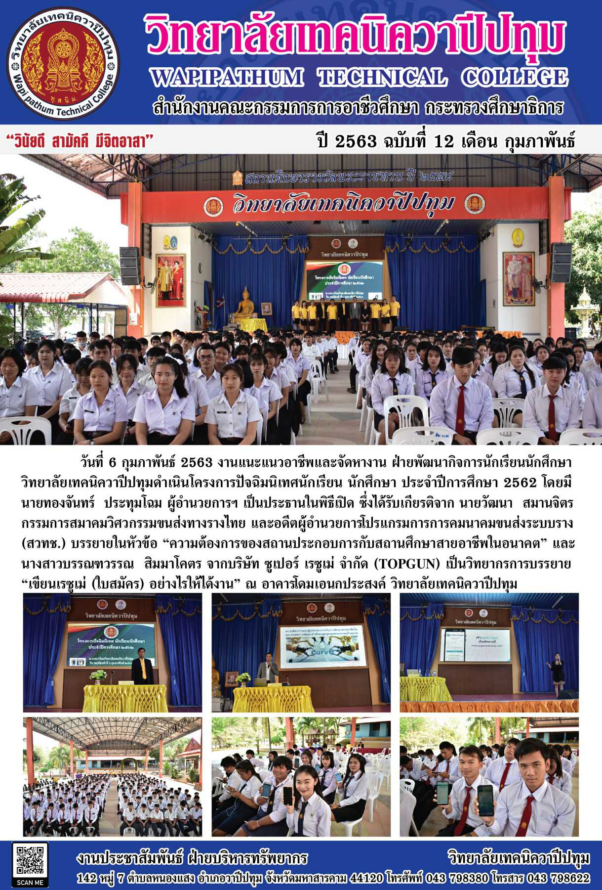 งานแนะแนวอาชีพและจัดหางาน ฝ่ายพัฒนากิจการนักเรียนนักศึกษา วิทยาลัยเทคนิควาปีปทุมดำเนินโครงการปัจฉิมนิเทศนักเรียน นักศึกษา ประจำปีการศึกษา 2562