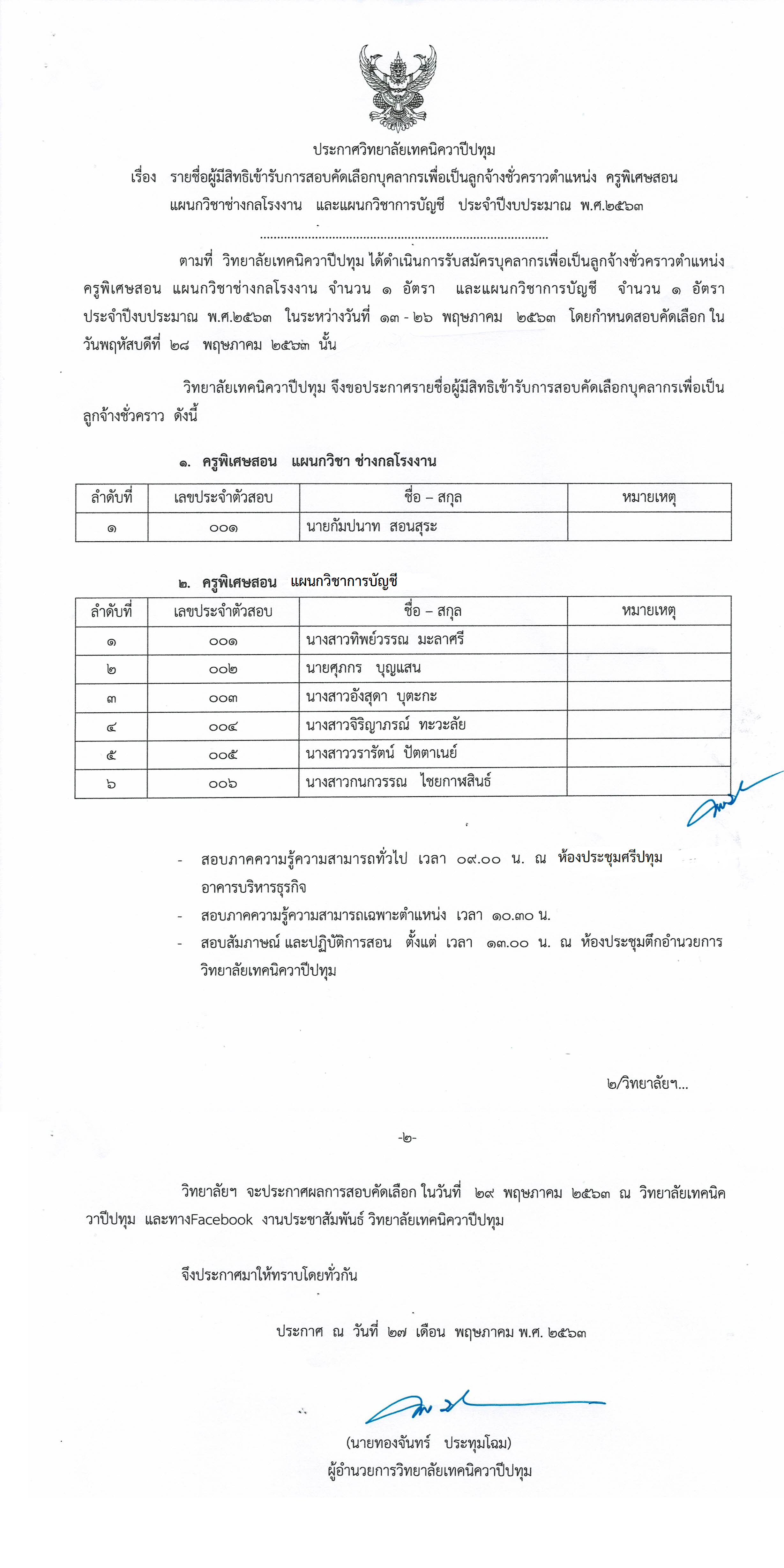 ประกาศวิทยาลัยเทคนิควาปีปทุม เรื่อง รายชื่อผู้มีสิทธิเข้ารับการสอบคัดเลือกบุคลากรเพื่อเป็นลูกจ้างชั่วคราวตำแหน่ง ครูพิเศษสอนแผนกวิชาช่างกลโรงงาน และแผนกวิชาการบัญชี