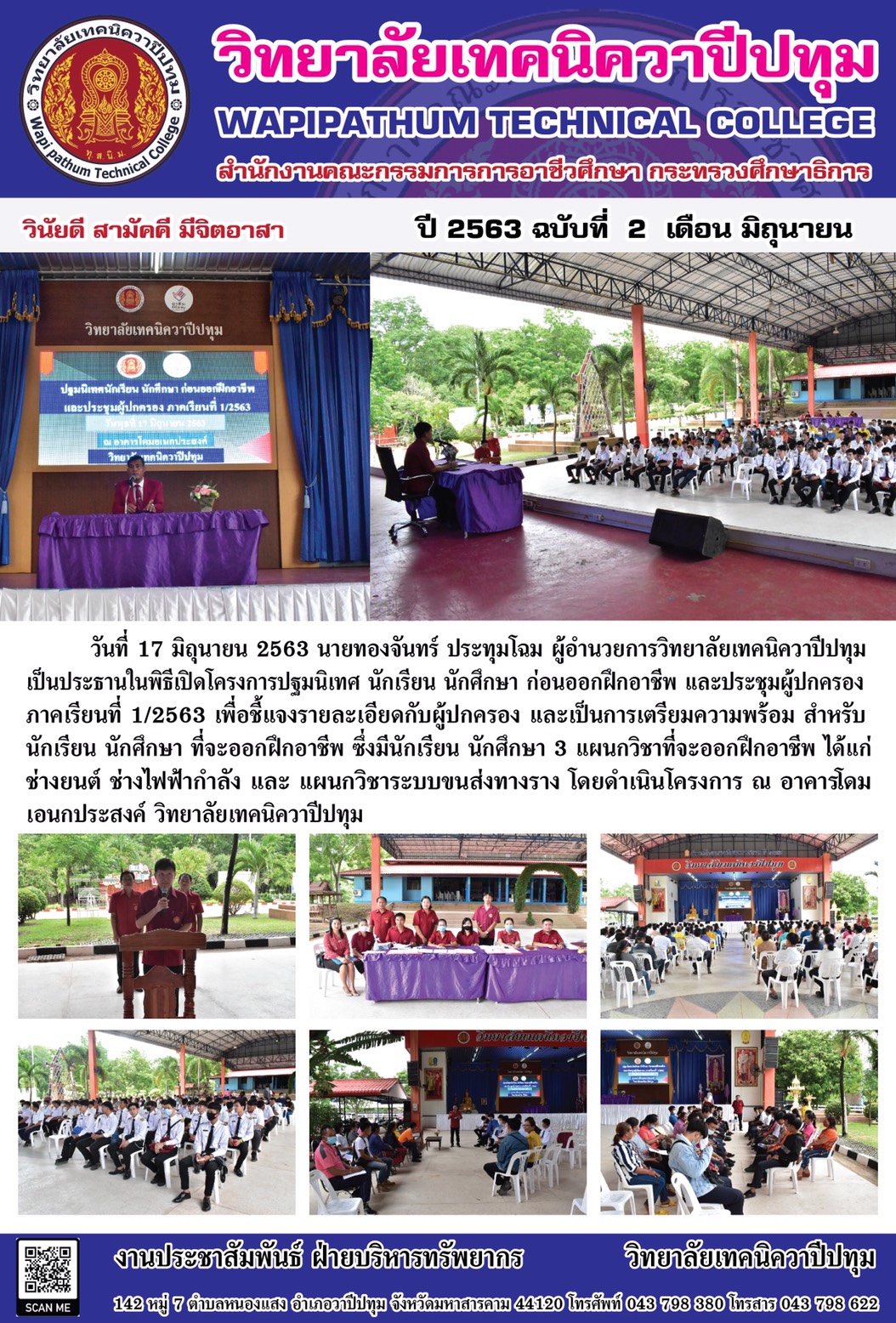 วิทยาลัยเทคนิควาปีปทุม จัดโครงการปฐมนิเทศ นักเรียน นักศึกษา ก่อนออกฝึกอาชีพ และประชุมผู้ปกครองภาคเรียนที่ 1/2563 ณ อาคารโดมเอนกประสงค์ วิทยาลัยเทคนิควาปีปทุม