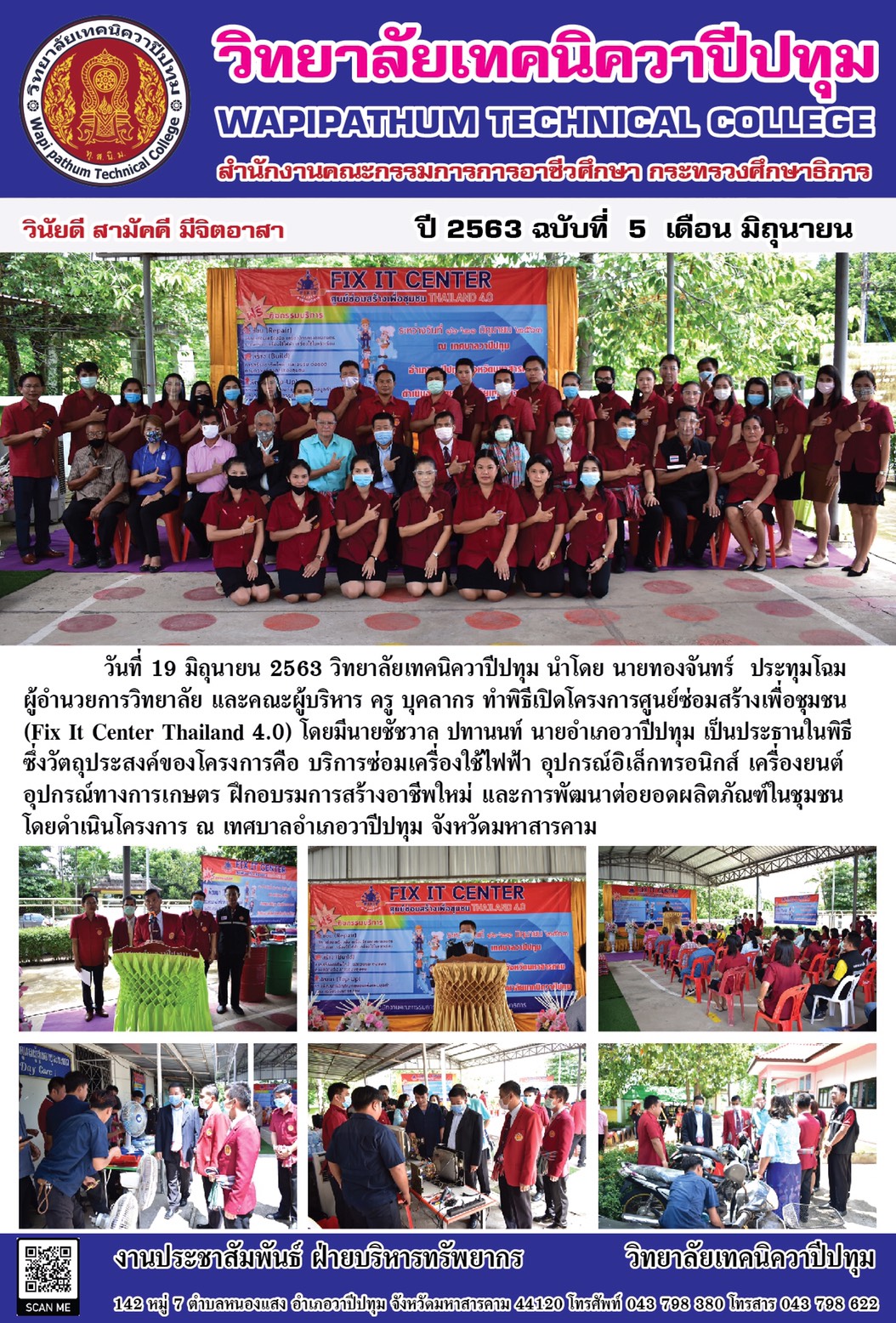 วิทยาลัยเทคนิควาปีปทุม ทำพิธีเปิดโครงการศูนย์ซ่อมสร้างเพื่อชุมชน (Fix It Canter Thailand 4.0) ณ เทศบาลอำเภอวาปีปทุม จังหวัดมหาสารคาม