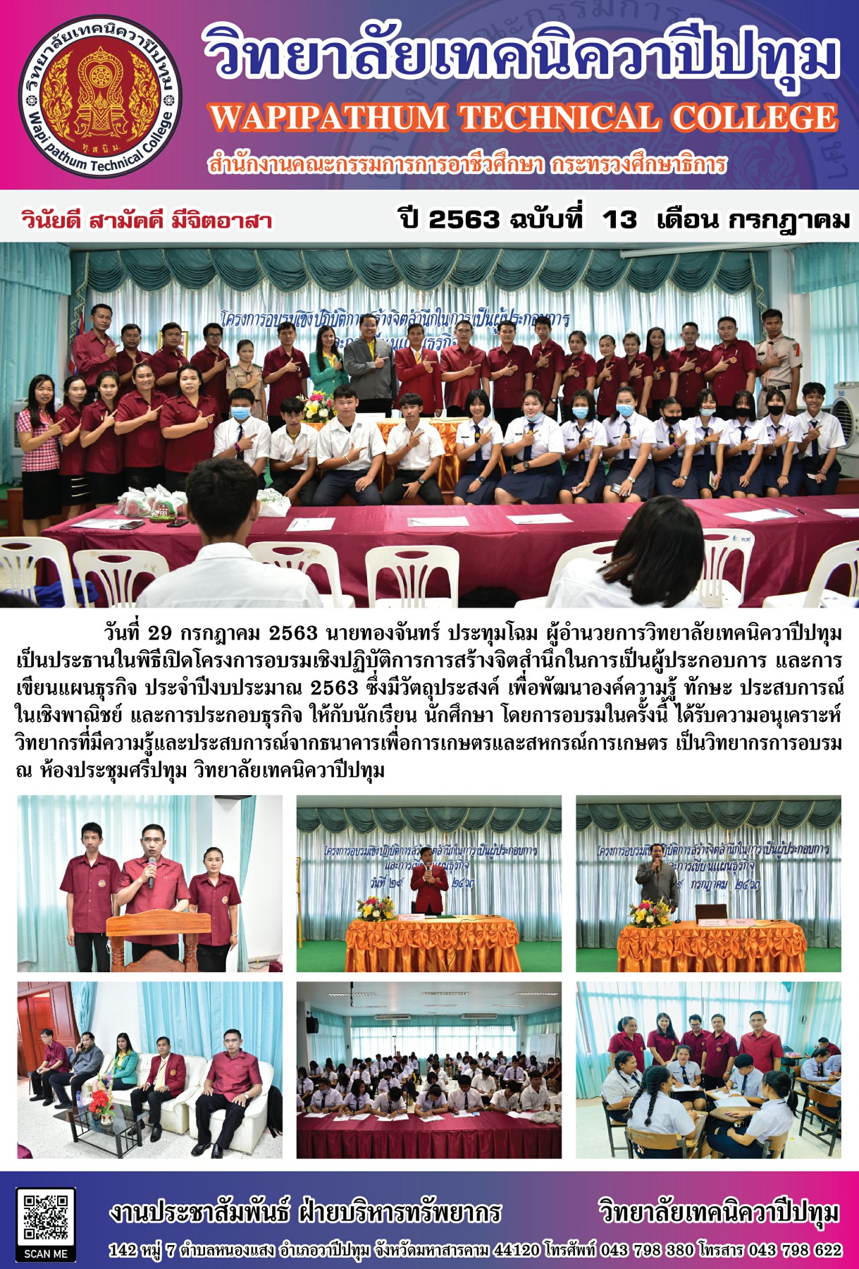 วิทยาลัยเทคนิควาปีปทุม เปิดโครงการอบรมเชิงปฏิบัติการการสร้างจิตสํานึกในการเป็นผู้ประกอบการ และการ เขียนแผนธุรกิจ ประจําปีงบประมาณ 2563