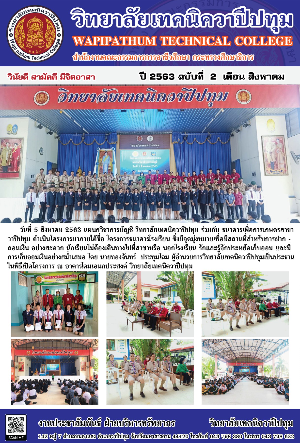แผนกวิชาการบัญชี วิทยาลัยเทคนิควาปีปทุม ร่วมกับ ธนาคารเพื่อการเกษตรสาขา วาปีปทุม ดําเนินโครงการมาภายใต้ชื่อ โครงการธนาคารโรงเรียน