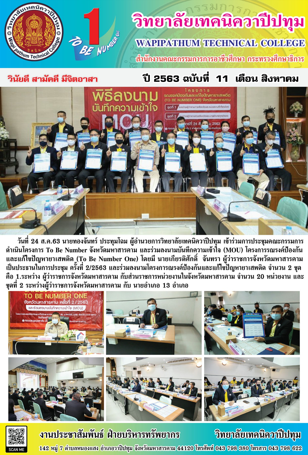 วิทยาลัยเทคนิควาปีปทุม เข้าร่วมการประชุมคณะกรรมการ ดําเนินโครงการ To Be Number จังหวัดมหาสารคาม และร่วมลงนามบันทึกความเข้าใจ (MOU) โครงการรณรงค์ป้องกัน และแก้ไขปัญหายาเสพติด (To Be Number One)