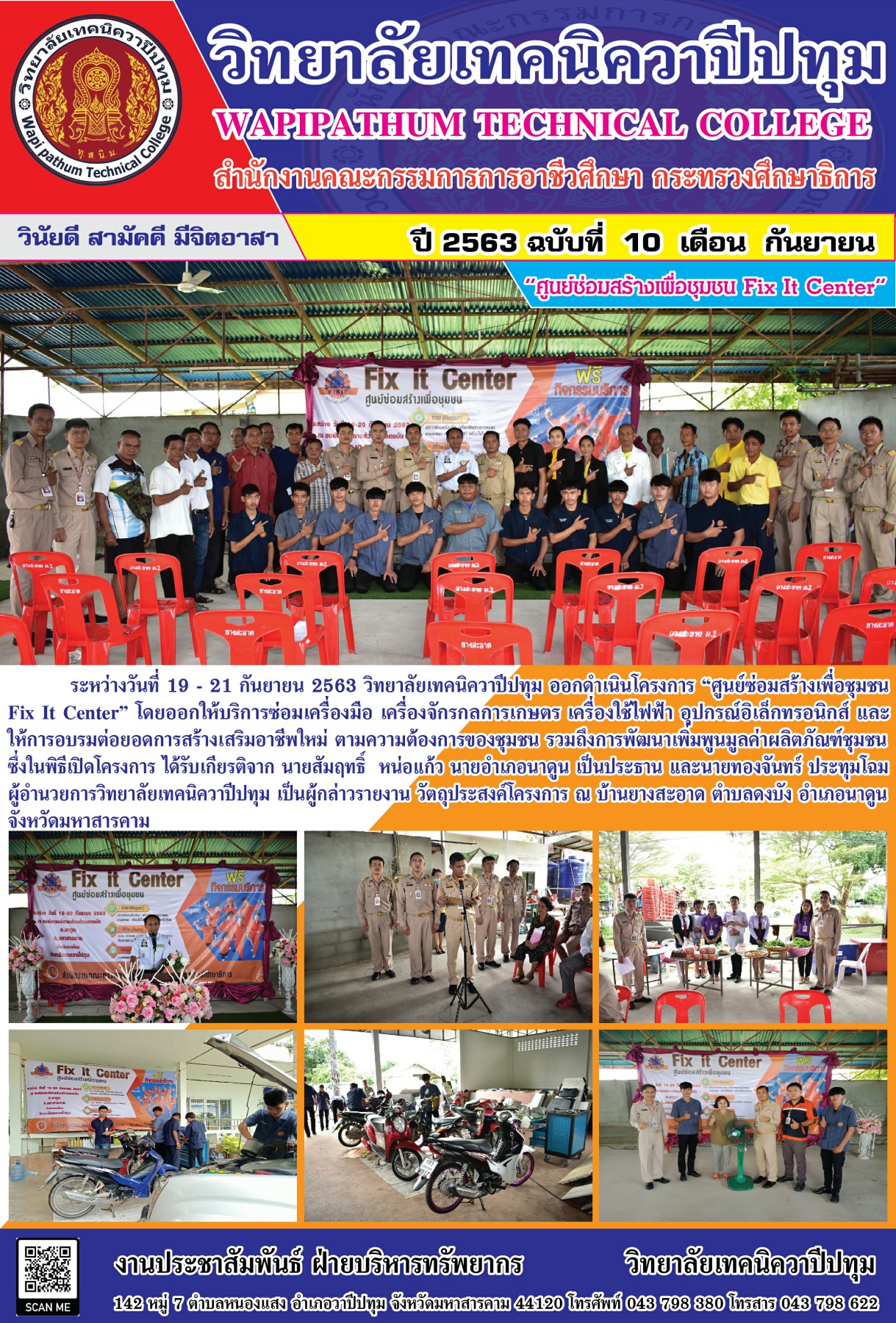 วิทยาลัยเทคนิควาปีปทุม ออกดําเนินโครงการ ?ศูนย์ซ่อมสร้างเพื่อชุมชน Fix It Center? โดยออกให้บริการซ่อมเครื่องมือ เครื่องจักรกลการเกษตร เครื่องใช้ไฟฟ้า อุปกรณ์อิเล็กทรอนิกส์