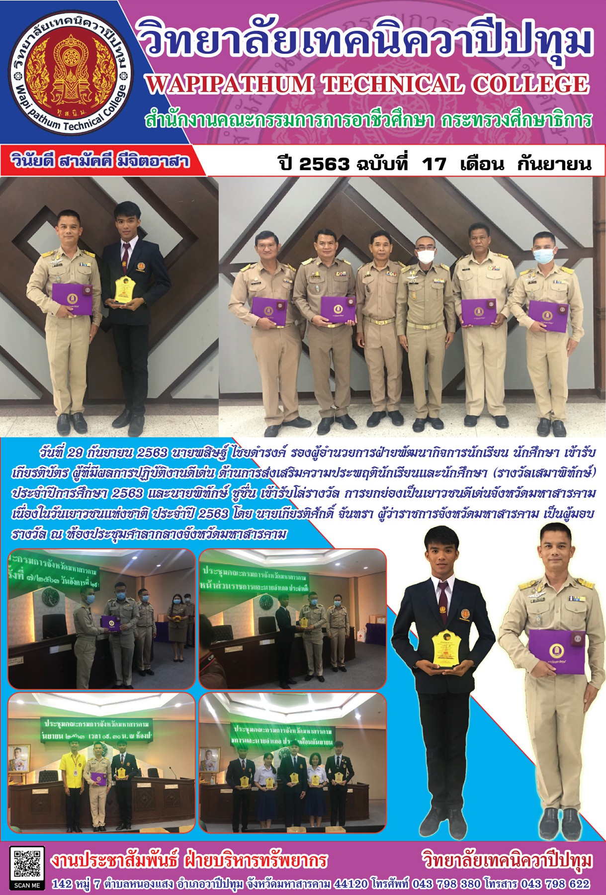 วิทยาลัยเทคนิควาปีปทุม เข้ารับเกียรติบัตร ผู้ที่มีผลการปฏิบัติงานดีเด่น ด้านการส่งเสริมความประพฤตินักเรียนและนักศึกษา