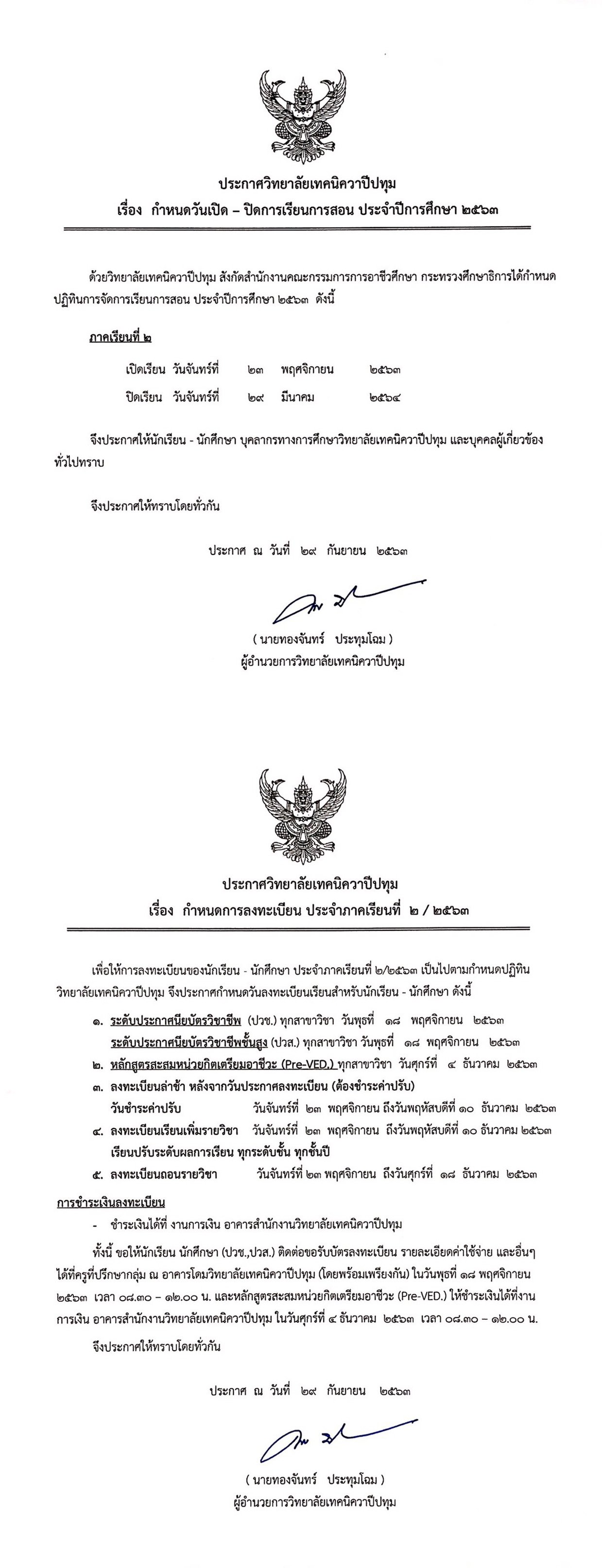 ประกาศวิทยาลัยเทคนิควาปีปทุม เรื่อง กำหนดวันเปิด-ปิดการเรียนการสอน ประจำปีการศึกษา 2563 และกำหนดการลงทะเบียน ประจำภาคเรียนที่ 2/2563