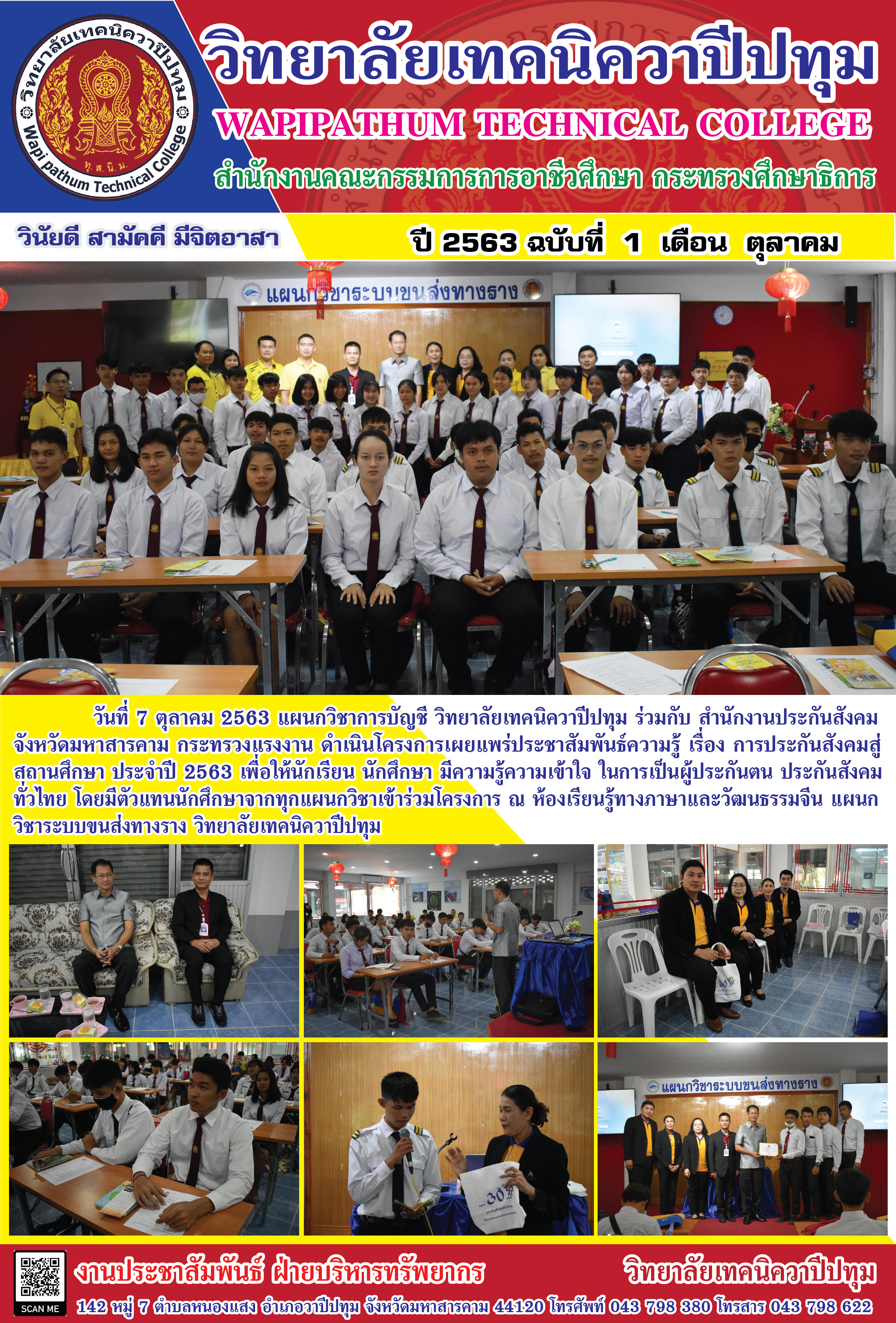วิทยาลัยเทคนิควาปีปทุม ร่วมกับ สำนักงานประกันสังคม จังหวัดมหาสารคาม ดำเนินโครงการเผยแพร่ประชาสัมพันธ์ความรู้ เรื่อง การประกันสังคมสู่สถานศึกษา ประจำปี 2563