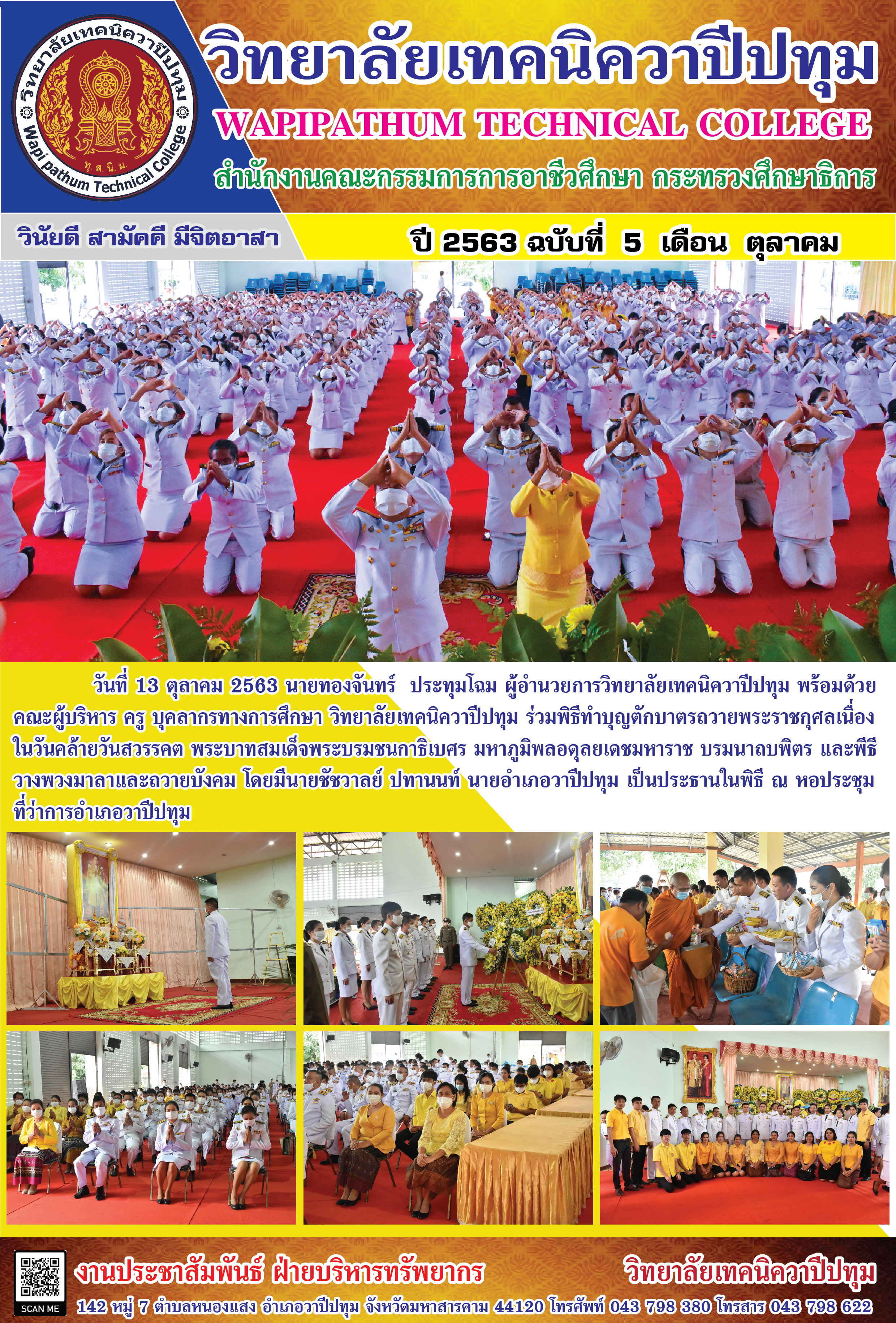 วิทยาลัยเทคนิควาปีปทุม ร่วมพิธีทำบุญตักบาตรถวายพระราชกุศลเนื่องในวันคล้ายวันสวรรคต พระบาทสมเด็จพระบรมชนกาธิเบศร มหาภูมิพลอดุลยเดชมหาราช บรมนาถบพิตร และพีธีวางพวงมาลาและถวายบังคม