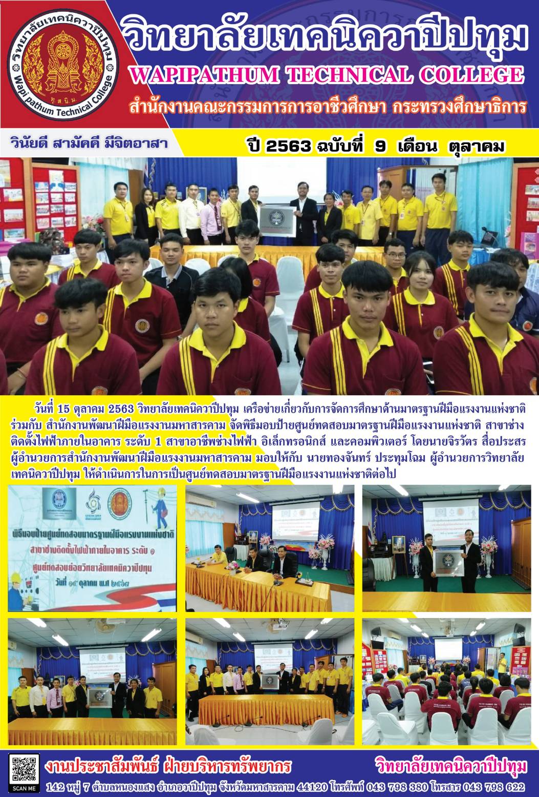 วิทยาลัยเทคนิควาปีปทุม เครือข่ายเกี่ยวกับการจัดการศึกษาด้านมาตรฐานฝีมือแรงงานแห่งชาติ ร่วมกับ สํานักงานพัฒนาฝีมือแรงงานมหาสารคาม จัดพิธีมอบป้ายศูนย์ทดสอบมาตรฐานฝีมือแรงงานแห่งชาติ