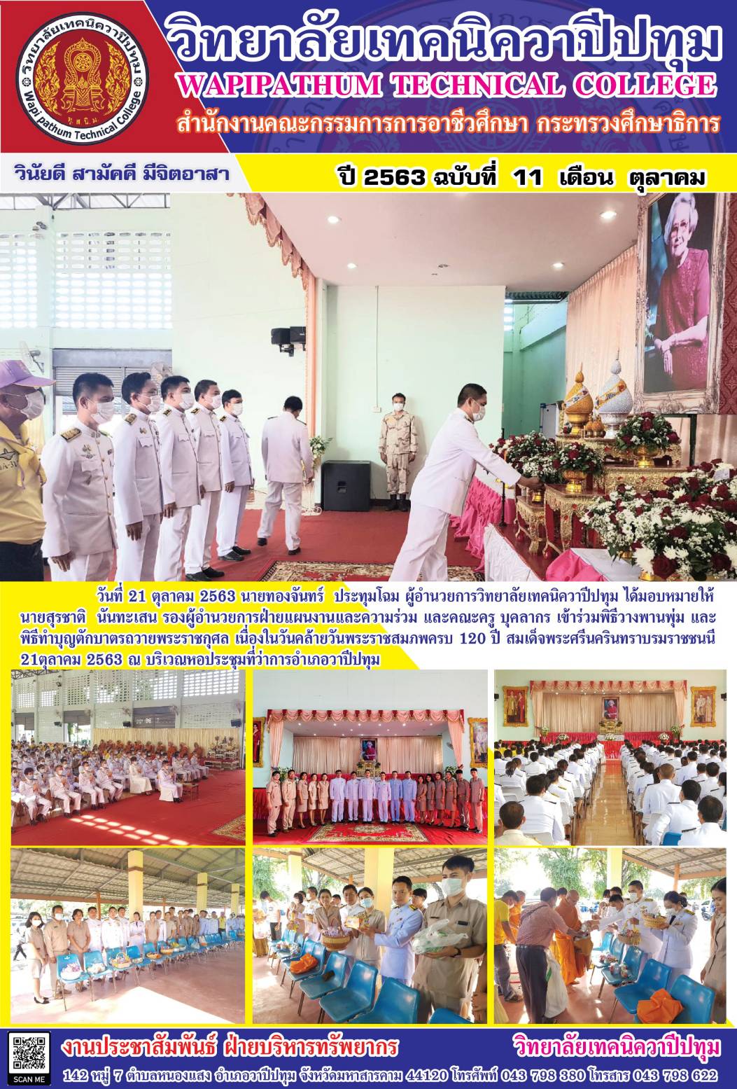 วิทยาลัยเทคนิควาปีปทุม เข้าร่วมพิธีวางพานพุ่ม และพิธีทำบุญตักบาตรถวายพระราชกุศล เนื่องในวันคล้ายวันพระราชสมภพครบ 120 ปี สมเด็จพระศรีนครินทราบรมราชชนนี