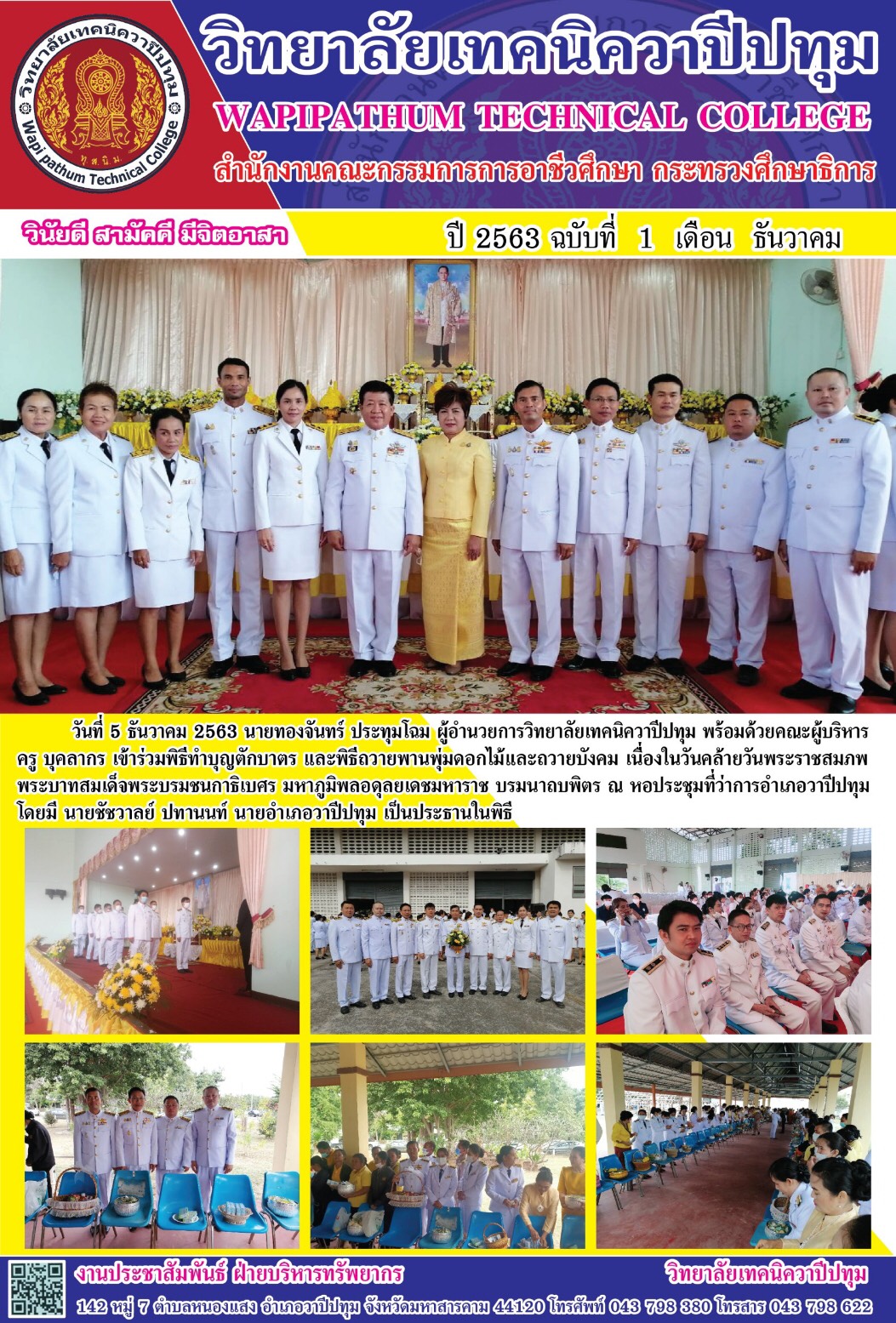 วิทยาลัยเทคนิควาปีปทุม เข้าร่วมพิธีทำบุญตักบาตร และพิธีถวายพานพุ่นดอกไม้และถวายบังคม เนื่องในวันคล้ายวันพระราชสมภพ ร.9 ณ หอประชุมที่ว่าการอำเภอวาปีปทุม