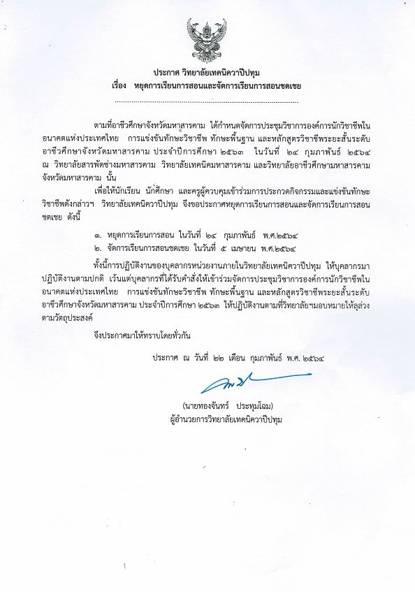 ประกาศวิทยาลัยเทคนิควาปีปทุม เรื่อง หยุดการเรียนการสอนและจัดการเรียนการสอนชดเชย