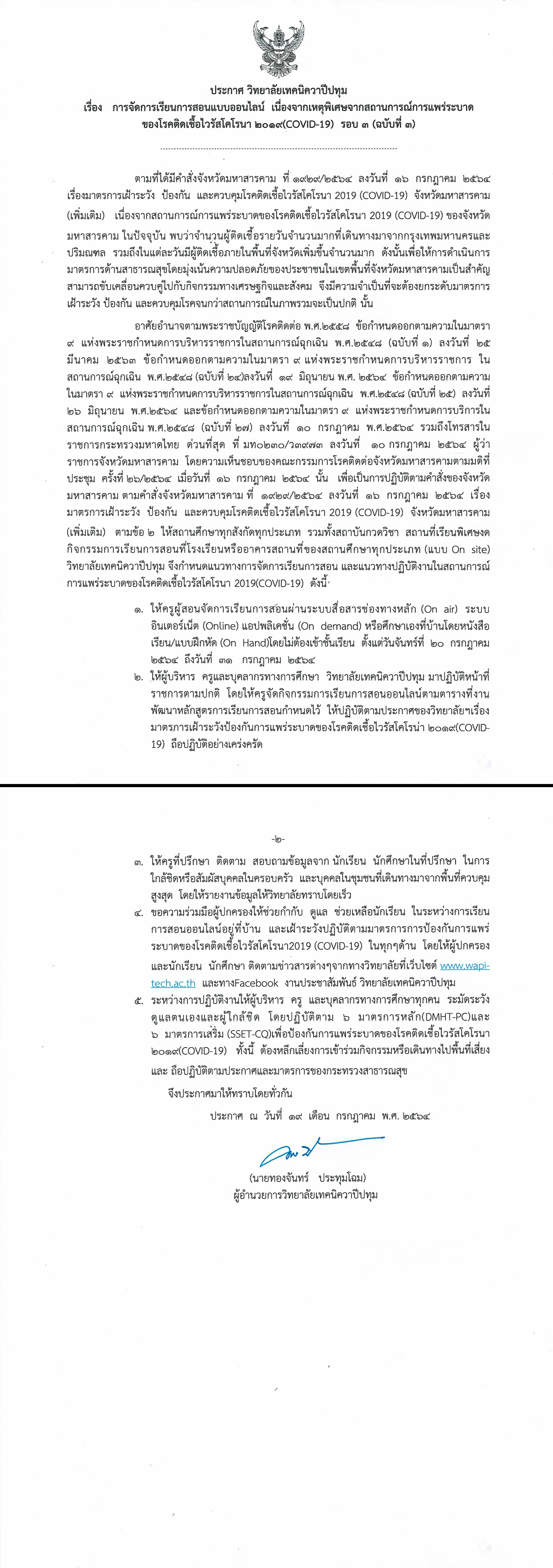 ประกาศวิทยาลัยเทคนิควาปีปทุมเรื่อง การจัดการเรียนการสอนแบบออนไลน์ เนื่องจากเหตุพิเศษจากสถานการณ์การแพร่ระบาด ของโรคติดเชื้อไวรัสโคโรนา 2019(COVID-19) รอบ 3 (ฉบับที่ 3)