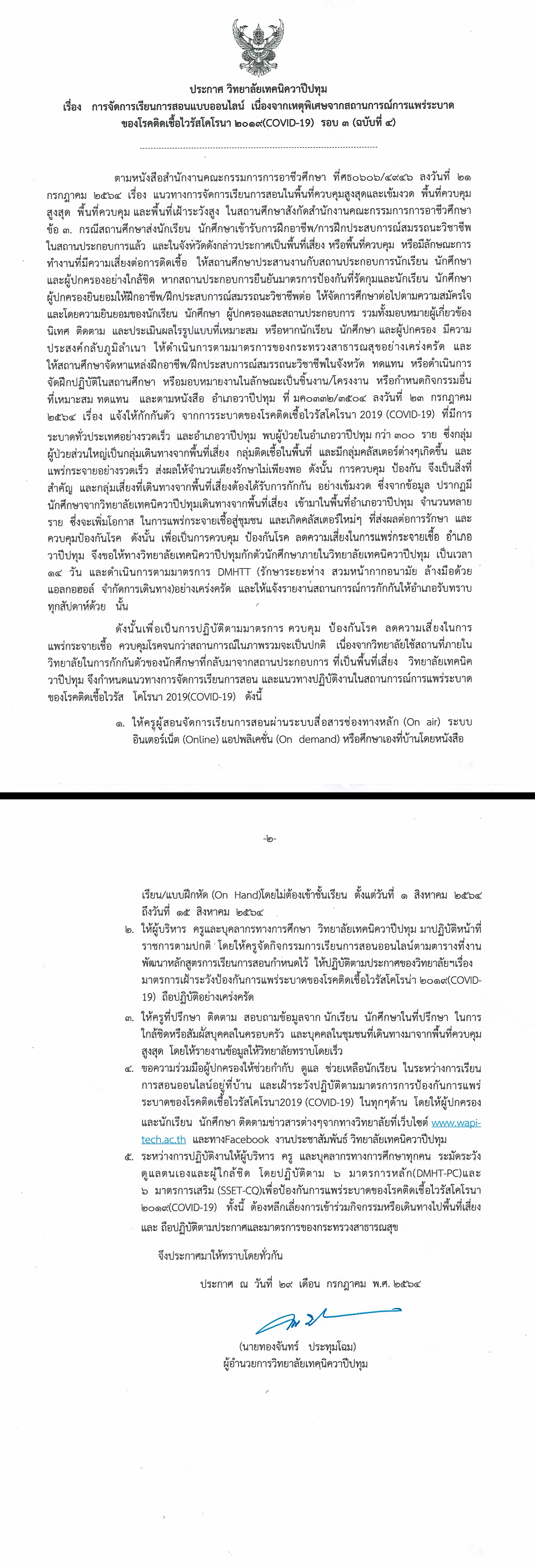 ประกาศ วิทยาลัยเทคนิควาปีปทุม เรื่อง การจัดการเรียนการสอนแบบออนไลน์ เนื่องจากเหตุพิเศษจากสถานการณ์การแพร่ระบาด ของโรคติดเชื้อไวรัสโคโรนา 2019(COVID-19) รอบ 3 (ฉบับที่ ๔)