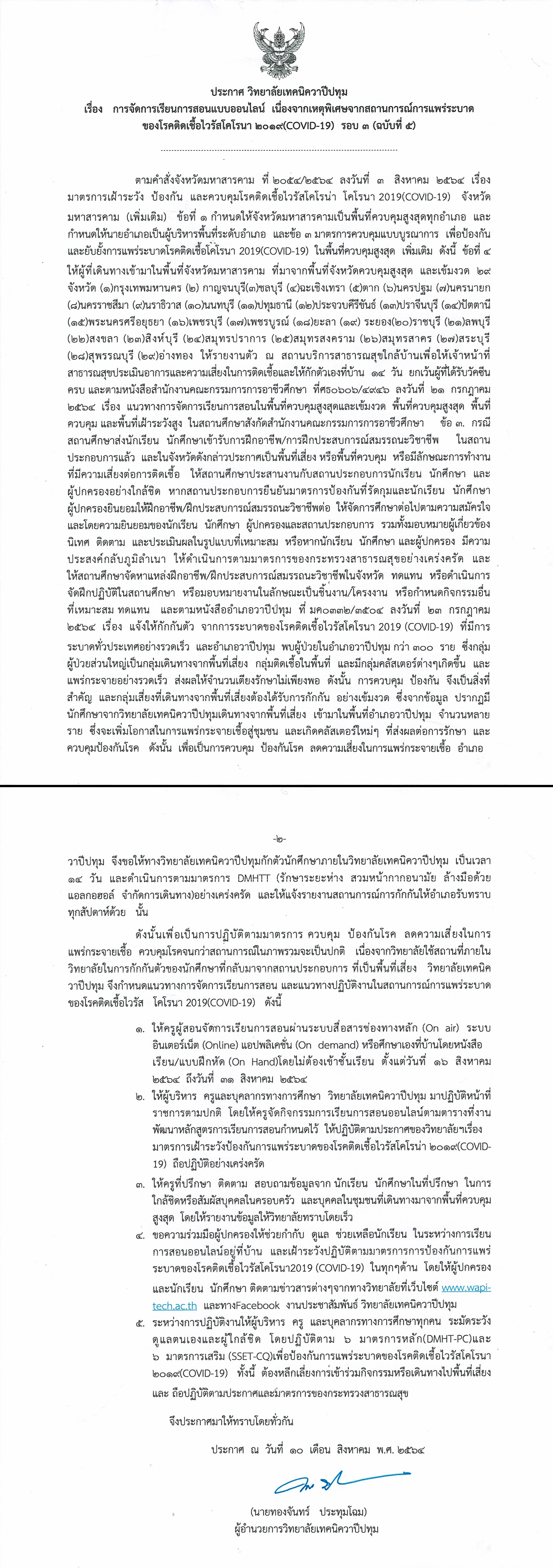 ประกาศ วิทยาลัยเทคนิควาปีปทุม เรื่อง การจัดการเรียนการสอนแบบออนไลน์ เนื่องจากเหตุพิเศษจากสถานการณ์การแพร่ระบาด ของโรคติดเชื้อไวรัสโคโรนา 2019(COVID-19) รอบ 3 (ฉบับที่ 5)