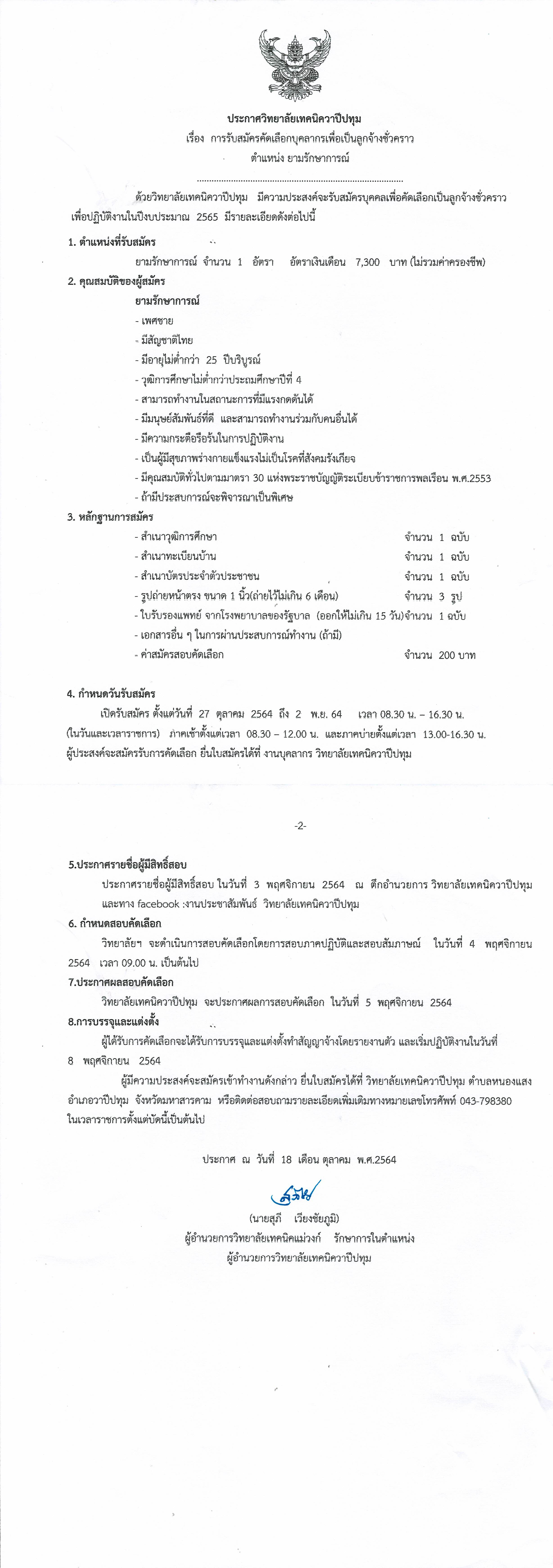 ประกาศวิทยาลัยเทคนิควาปีปทุม เรื่อง การรับสมัครคัดเลือกบุคลากรเพื่อเป็นลูกจ้างชั่วคราว ตำแหน่ง ยามรักษาการณ์