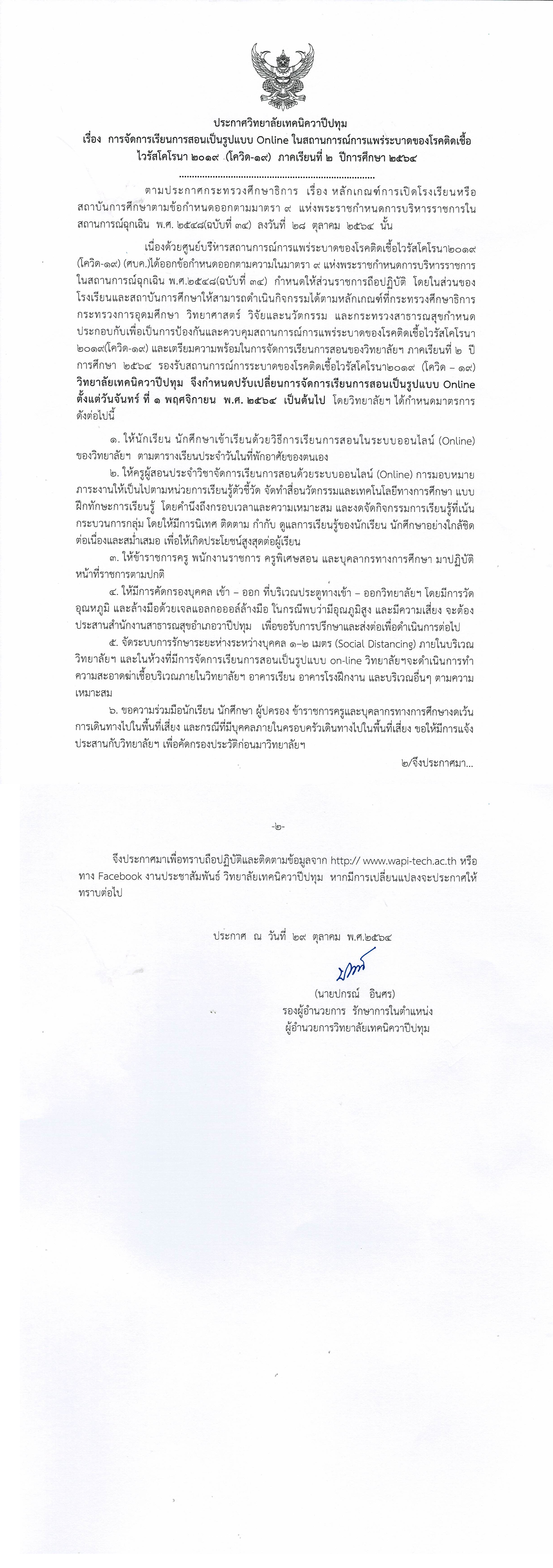 ประกาศ วิทยาลัยเทคนิควาปีปทุม เรื่อง การจัดการเรียนการสอนแบบออนไลน์ ในสถานการณ์การแพร่ระบาดของโรคติดเชื้อไวรัสโคโรนา 2019(COVID-19) ภาคเรียนที่ 2 ปีการศึกษา 2564