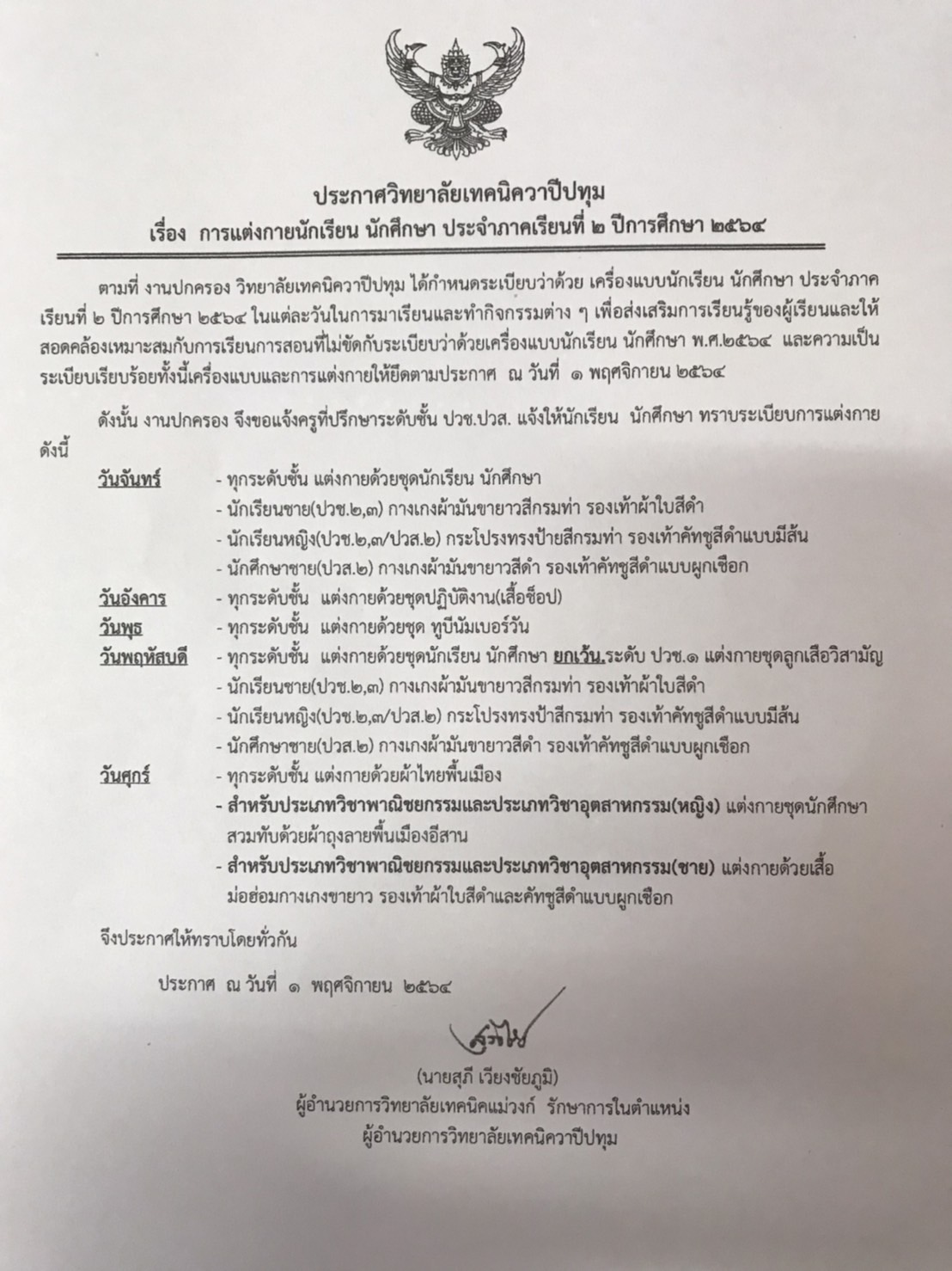 ประกาศวิทยาลัยเทคนิควาปีปทุม เรื่อง การแต่งกายนักเรียน นักศึกษา ประจำภาคเรียนที่ 2/2564