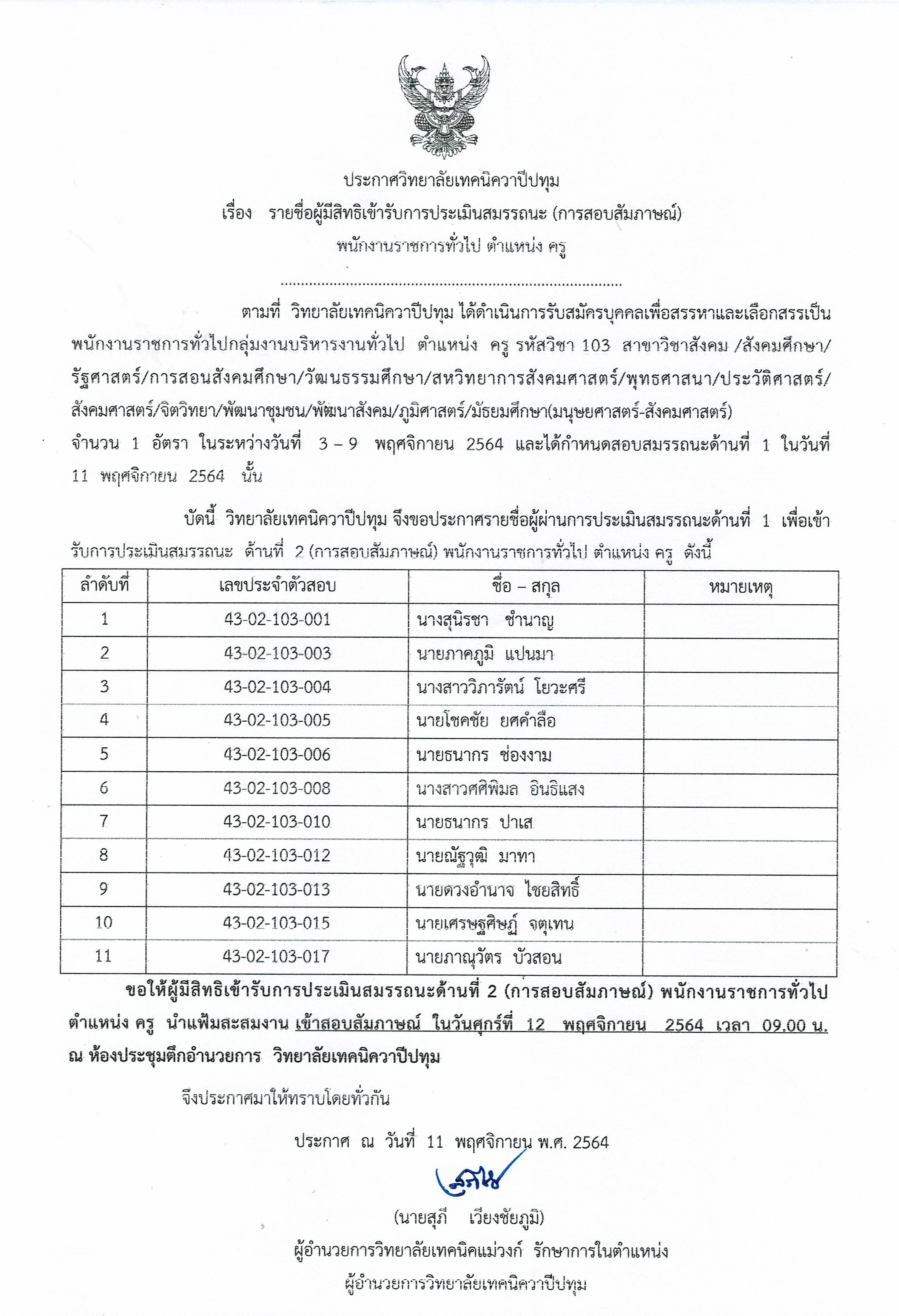 ประกาศวิทยาลัยเทคนิควาปีปทุม เรื่อง รายชื่อผู้มีสิทธิเข้ารับการประเมินสมรรถนะ (การสอบสัมภาษณ์) พนักงานราชการทั่วไป ตำแหน่ง ครู
