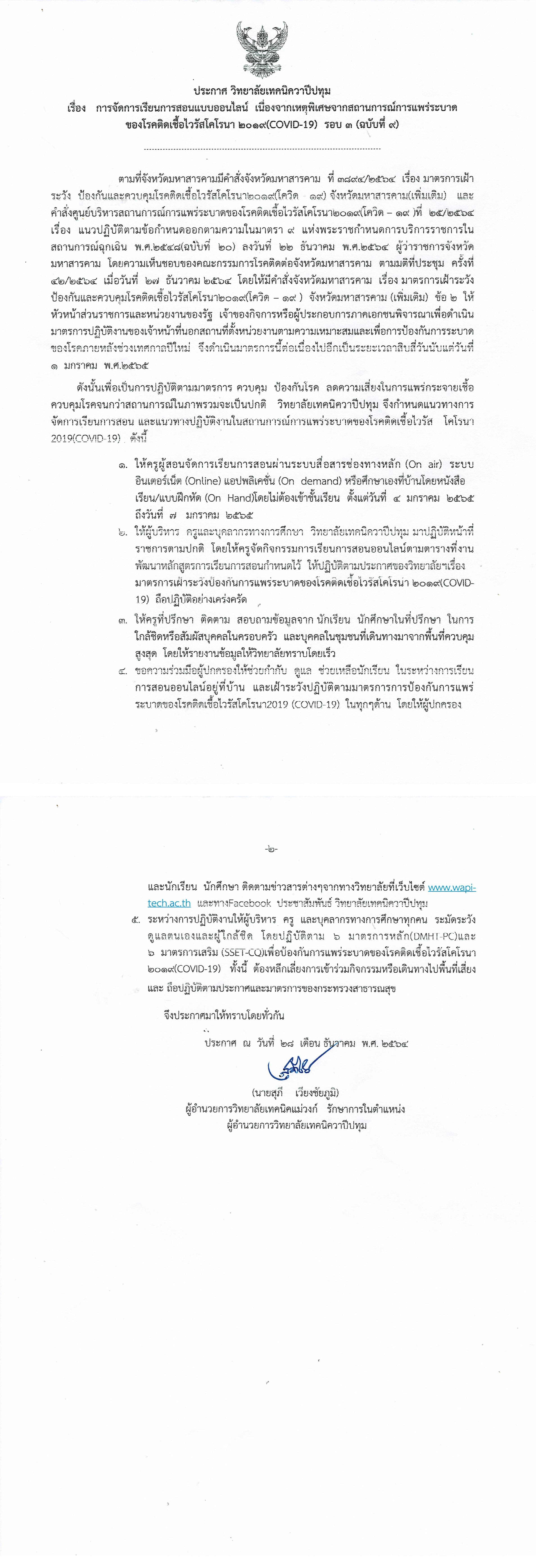ประกาศ วิทยาลัยเทคนิควาปีปทุม เรื่อง การจัดการเรียนการสอนแบบออนไลน์ เนื่องจากเหตุพิเศษจากสถานการณ์การแพร่ระบาด ของโรคติดเชื้อไวรัสโคโรนา 2019(COVID-19) รอบ 3 (ฉบับที่ 9)