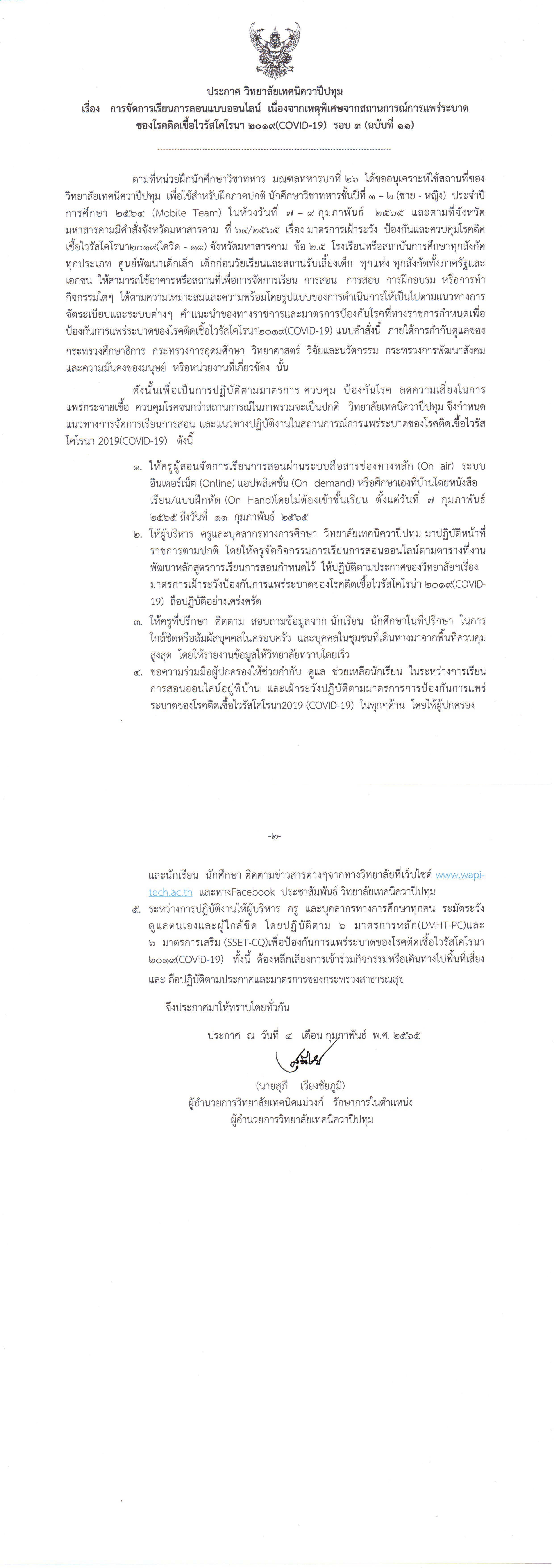 ประกาศ วิทยาลัยเทคนิควาปีปทุม เรื่อง การจัดการเรียนการสอนแบบออนไลน์ เนื่องจากเหตุพิเศษจากสถานการณ์การแพร่ระบาด ของโรคติดเชื้อไวรัสโคโรนา 2019(COVID-19) รอบ 3 (ฉบับที่ 11)