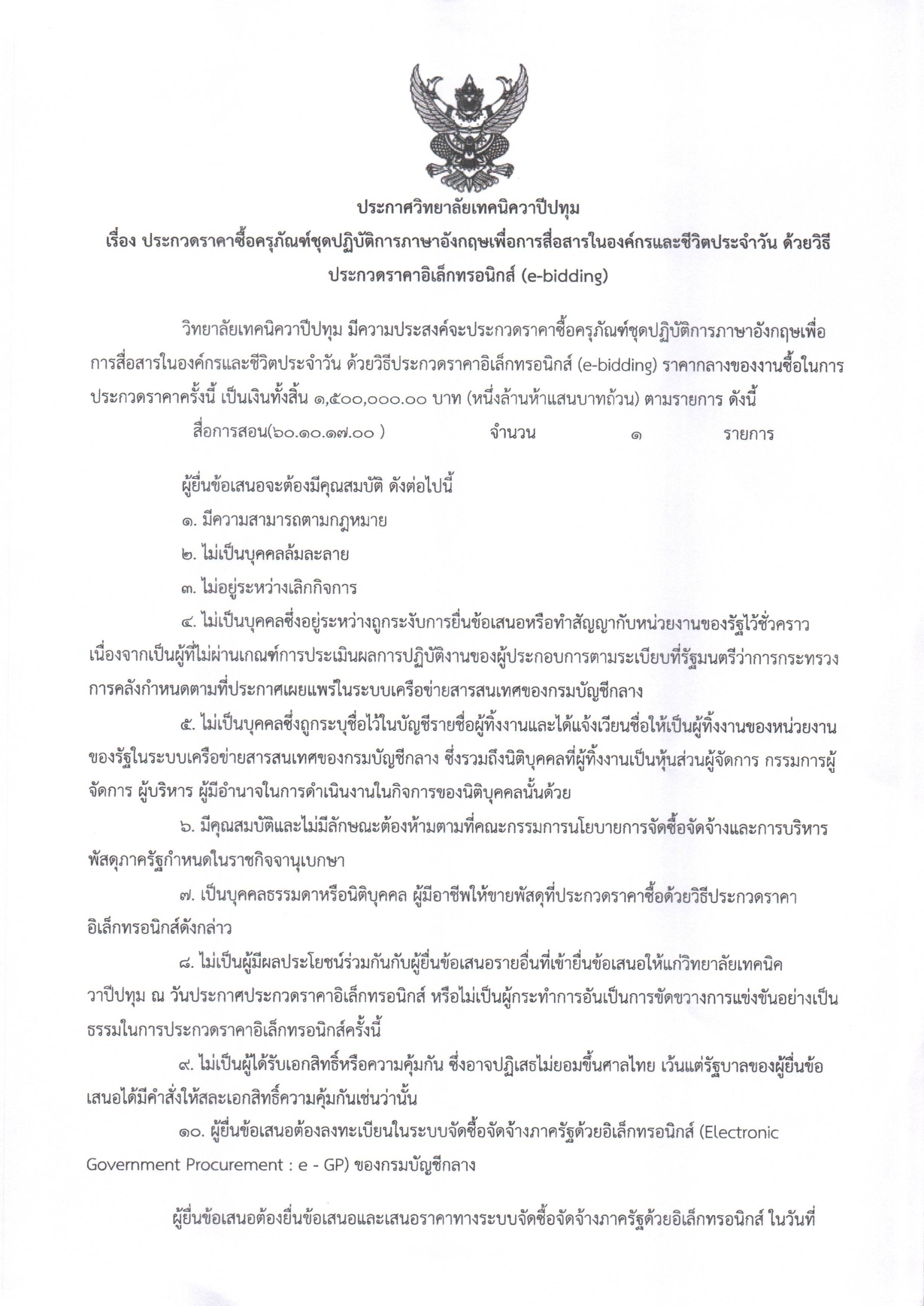 ประกาศวิทยาลัยเทคนิควาปีปทุม เรื่อง ประกวดราคาซื้อการซื้อครุภัณฑ์ชุดปฏิบัติการภาษาอังกฤษเพื่อการสื่อสารในองค์กรและชีวิตประจำวัน ด้วยวิธีประกวดราคาอิเล็กทรอนิกส์ (e-bidding)