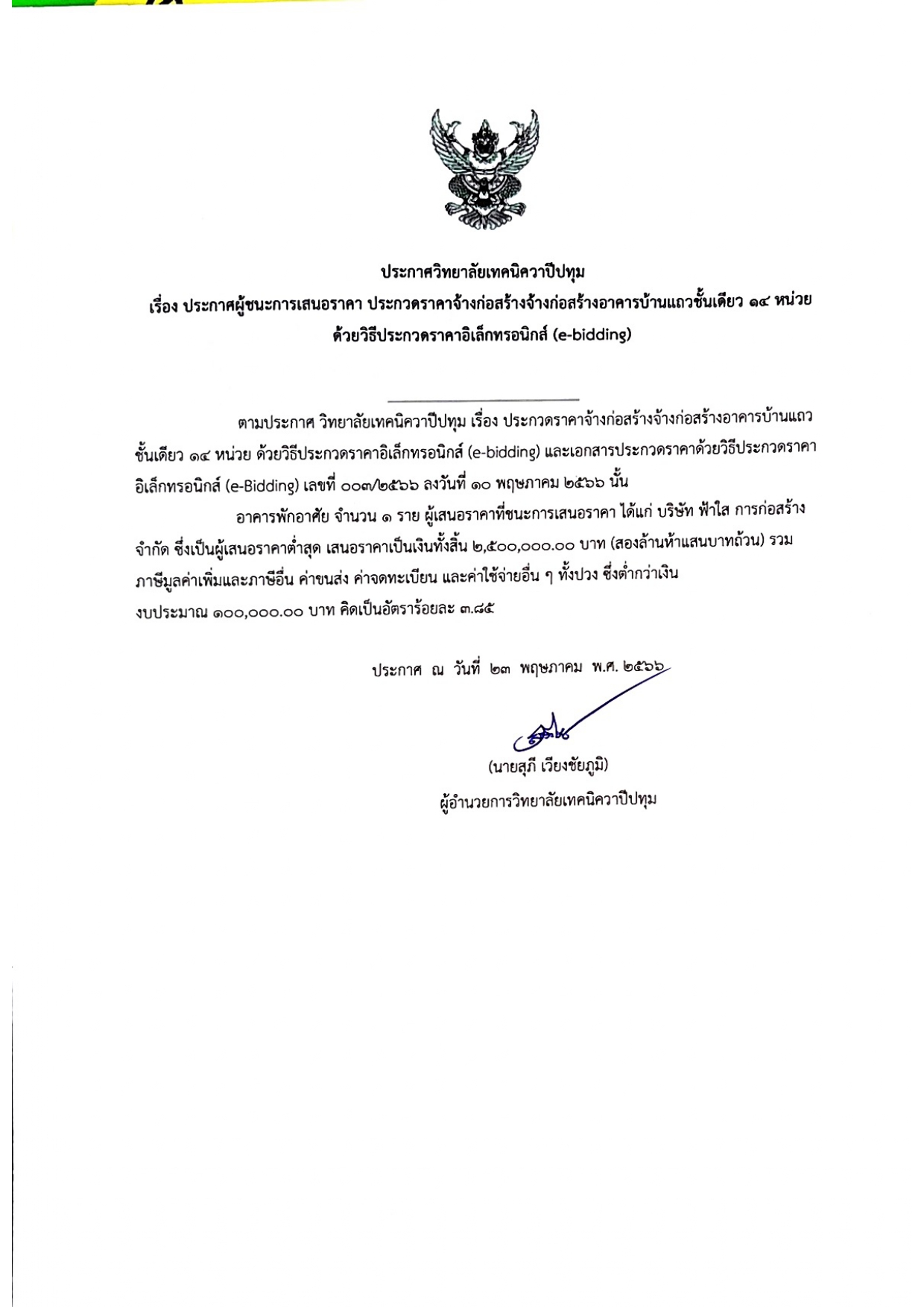 ประกาศวิทยาลัยเทคนิควาปีปทุม เรื่อง ประกาศผู้ชนะการเสนอราคา ประกวดราคาจ้างก่อสร้างอาคารบ้านแถวชั้นเดียว ๑๔ หน่วย ด้วยวิธีประกวดราคาอิเล็กทรอนิกส์ (e-bidding)
