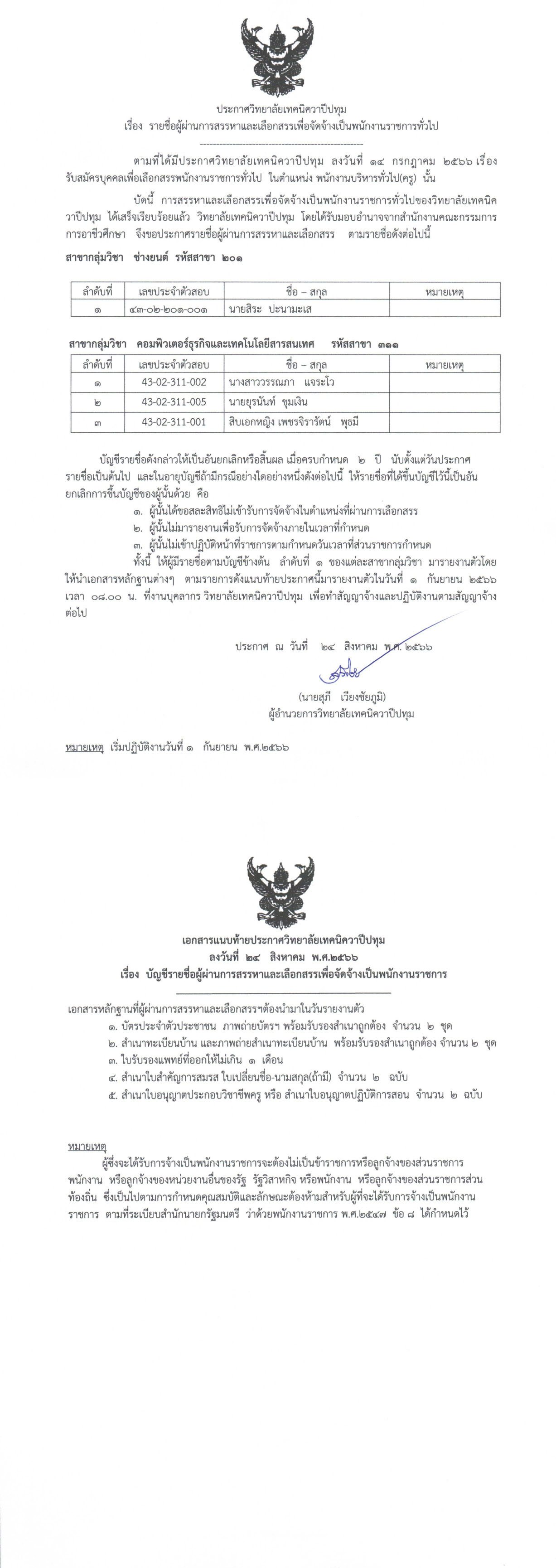 ประกาศวิทยาลัยเทคนิควาปีปทุม เรื่อง รายชื่อผู้ผ่านการสรรหาและเลือกสรรเพื่อจัดจ้างเป็นพนักงานราชการทั่วไป