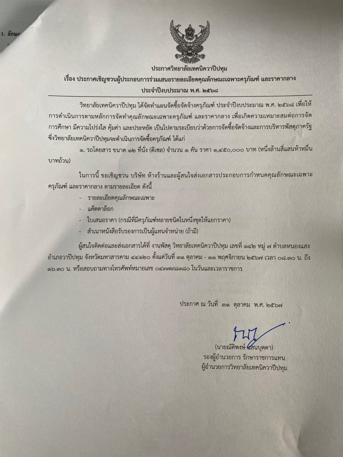ประกาศวิทยาลัยเทคนิควาปีปทุม เรื่อง ประกาศเชิญชวนผู้ประกอบการร่วมเสนอรายละเอียดคุณลักษณะเฉพาะครุภัณฑ์ และราคากลาง ประจำปีงบประมาณ พ.ศ. 2568